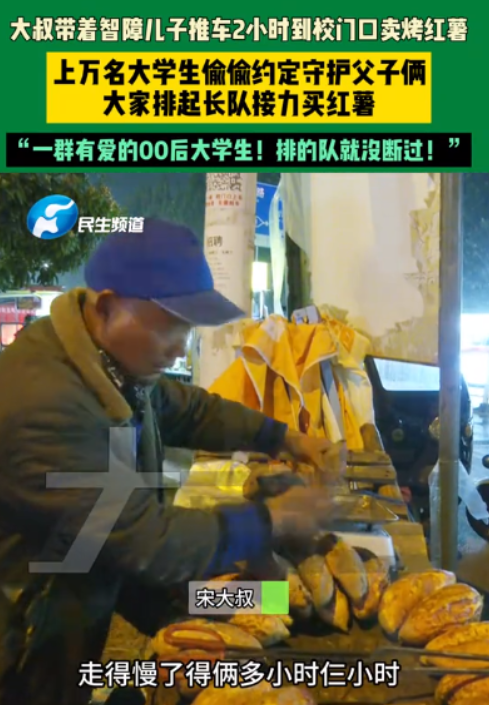 泪目了!11月12日一大叔带智障儿子推车2小时到大学门口卖烤红薯,上万名大学生排队购买,大叔也相当给力3.8元一个红薯,4块钱就给两个,学生们除了自己购买,还帮不少网友代买、代吃!