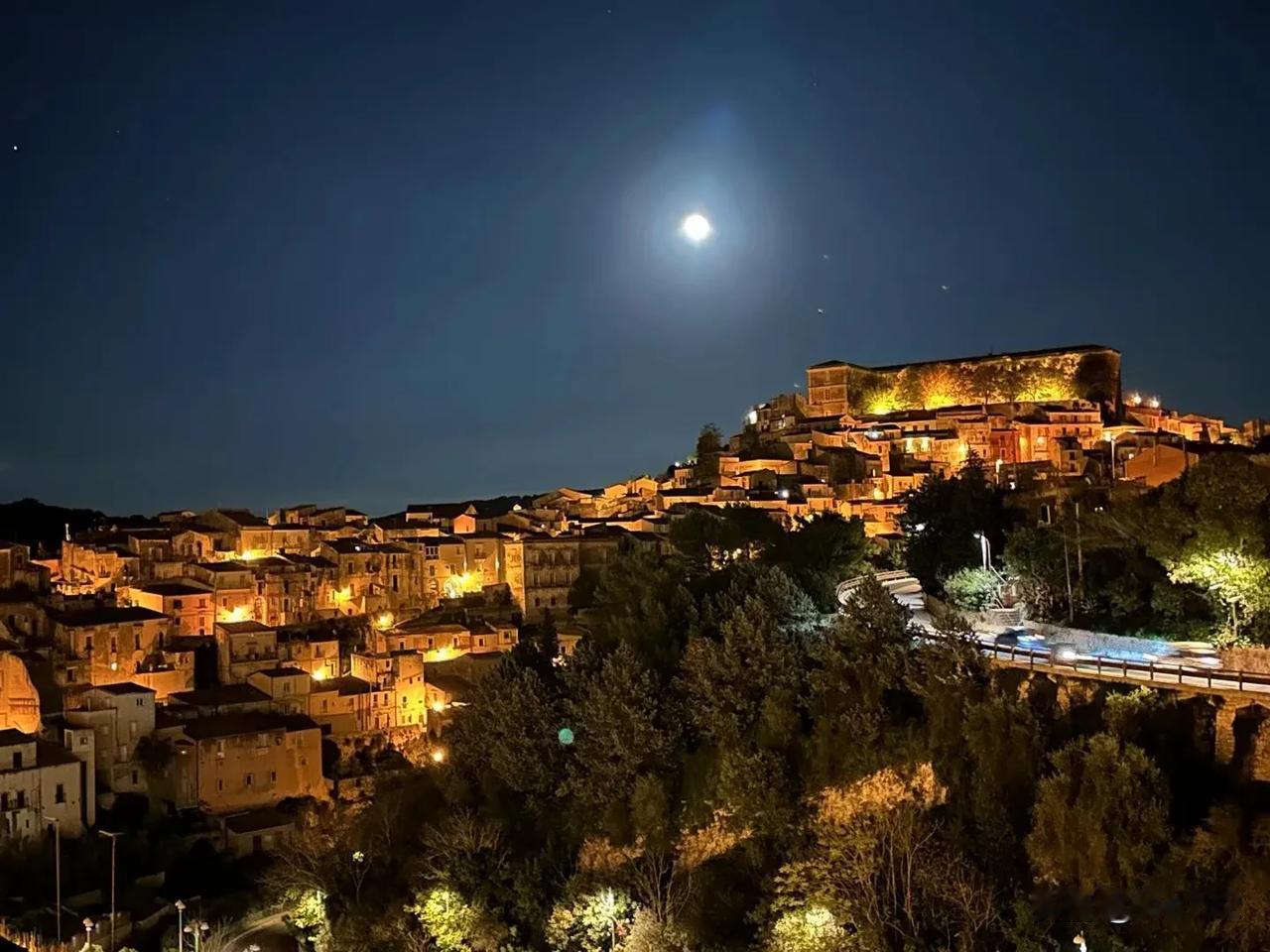 西西里岛拉古萨古城的夜晚,月亮又大又圆。 这里让我想起了意大利地图鞋跟那里的马泰