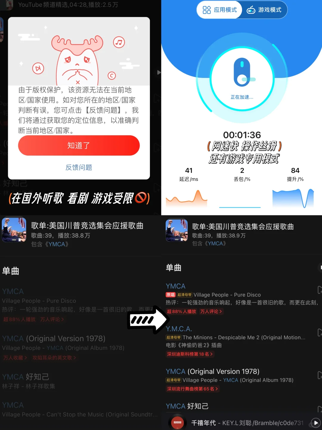 姐妹们 在国外你就会发现听音乐 看剧的时候一直会跳出来‘地域限制’直接变成灰色 但有了这个就可以丝滑使用了 还有游戏专用模式 不卡顿好用!!!