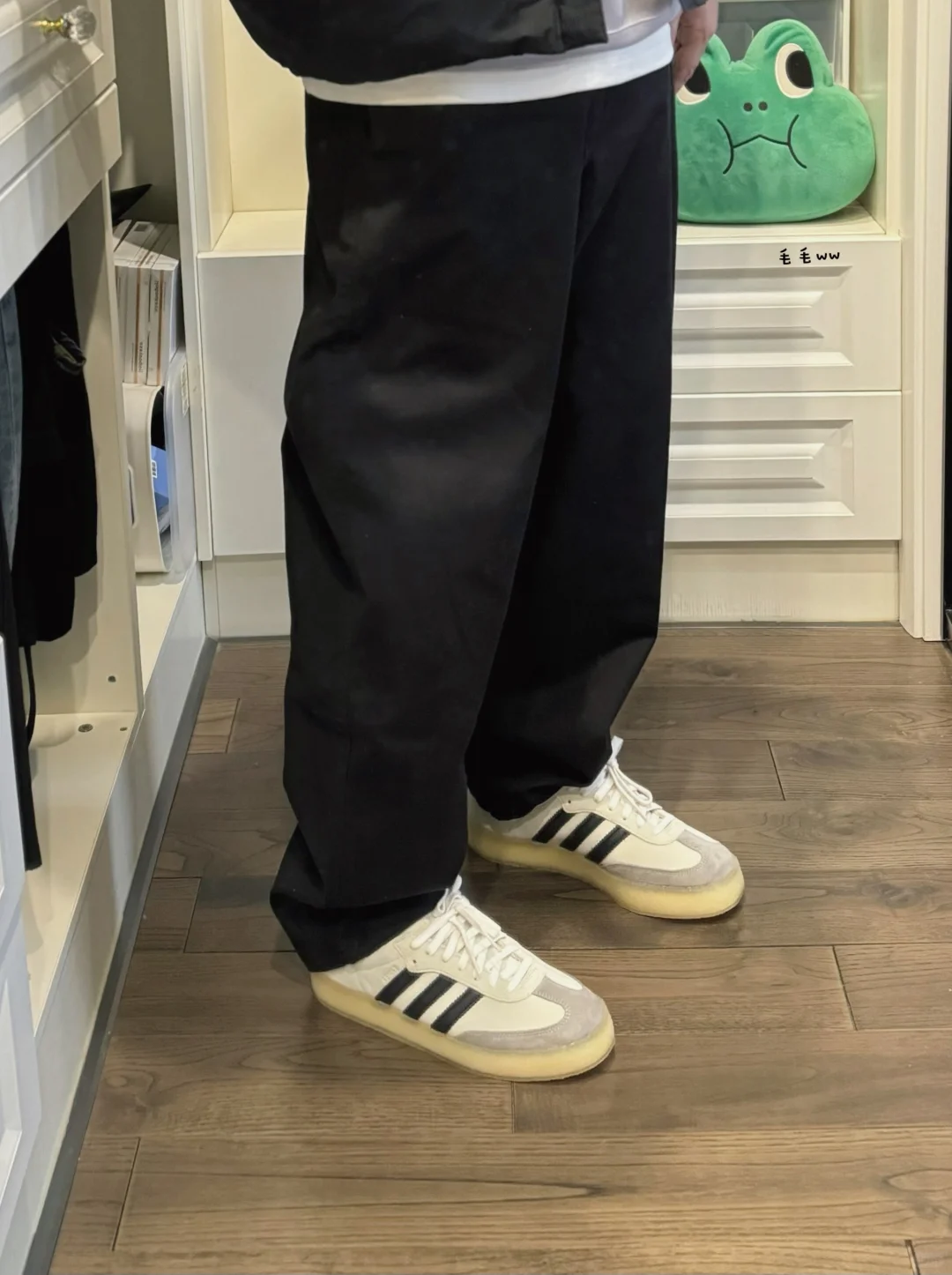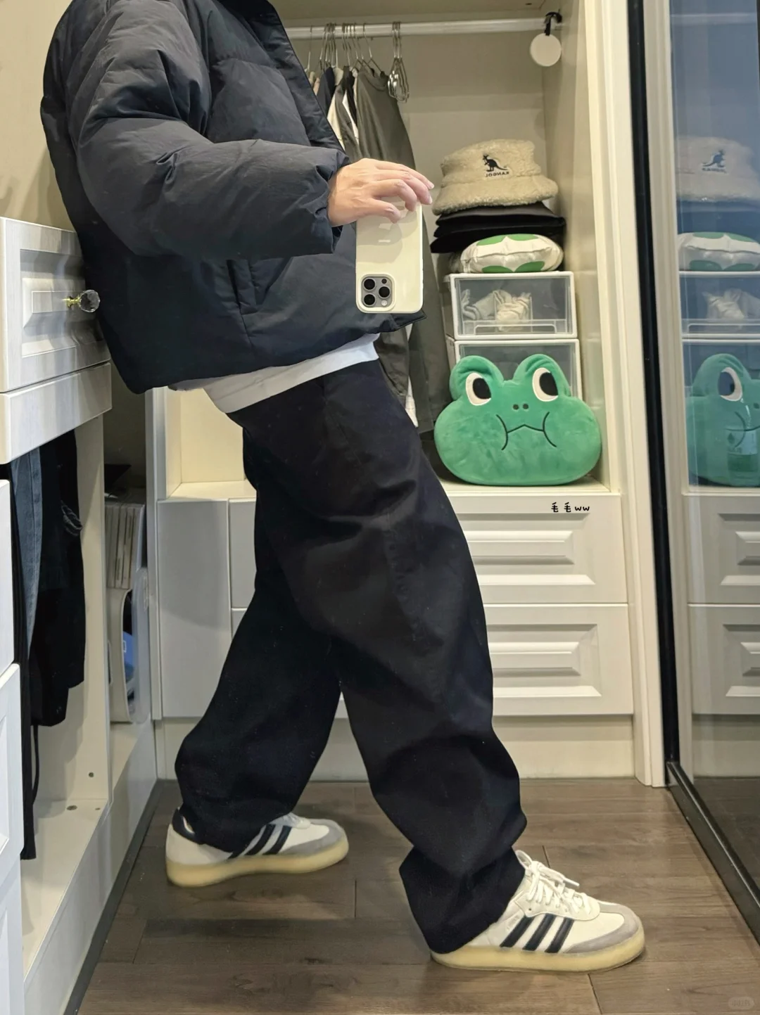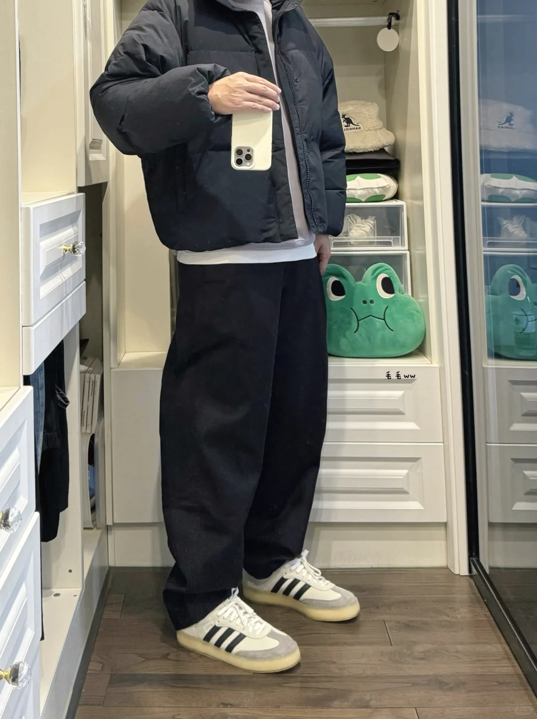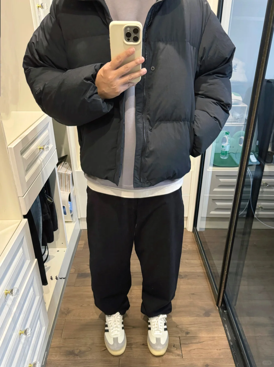 -秋冬配色选择,更耐看的还是黑白灰三色,整身没有印花跟图案,极简风格贯彻到底 . -上装短款棉服,下装无褶长裤,再来双德训或者T头鞋就可以出门,效果干净又简洁 . —————— . ✏️本人178cm75kg 球鞋尺码265mm(正常EU42) . 💭以上均为我个人观点,不喜勿喷,欢迎讨论