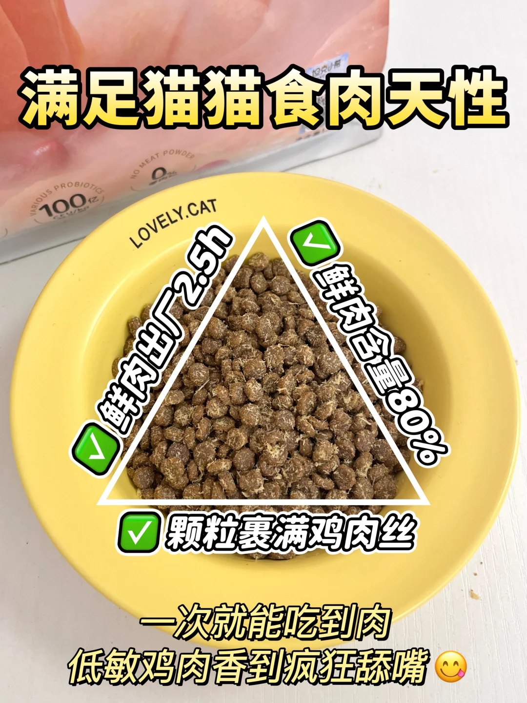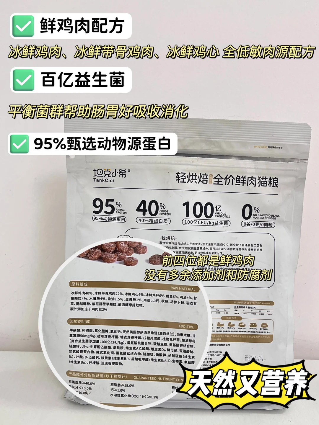 作为低敏鲜肉粮,这个一整袋95%的动物源蛋白,都是甄选的鸡肉,配料表前4位都是冰鲜肉,还有多种蔬果,没有过多人工营养添加剂,天然又营养,真的很少品牌能做到这么多食材!有口福的勒~