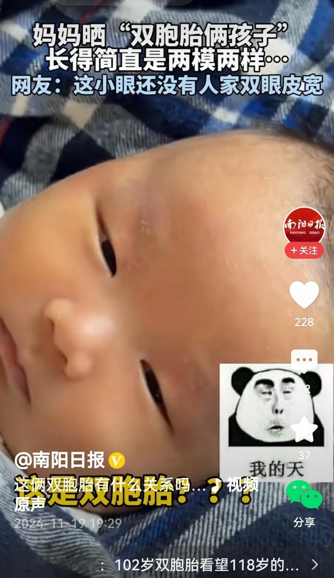 还真是,视频里的双胞胎一个双眼爆皮大眼睛,一个单眼皮还眯眯眼,没一点双胞胎的意思。 话说回来,双胞胎应该长得一模一样难以区分才对,为啥会大相径庭呢?个人理解,或许与同卵双胞胎还是异卵双胞胎有直接关系。具体来说,如果是同卵双胞胎,就会长得一模一样。如果是异卵双胞胎,长得像不像,像多少就会成为不确定的事情。或许这小哥俩是异卵双胞胎,才会长得两模两样吧。 正所谓:本是双胞胎,一点都不像。问题出在哪?异卵双胞胎。 (个人观点,内容取材于网络)