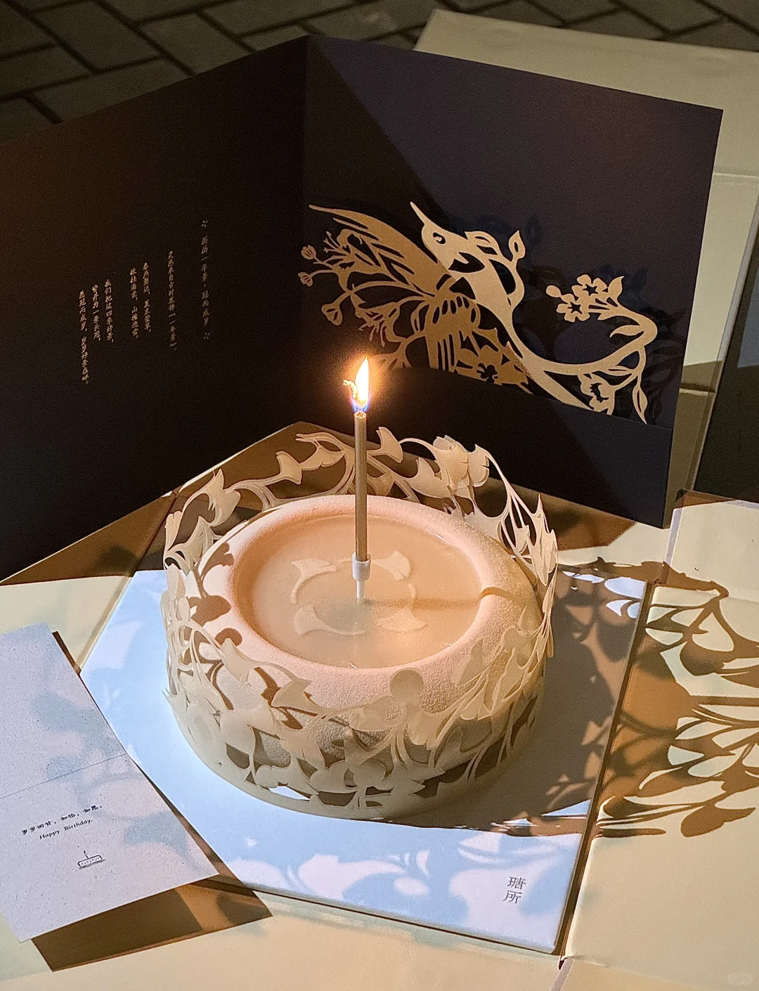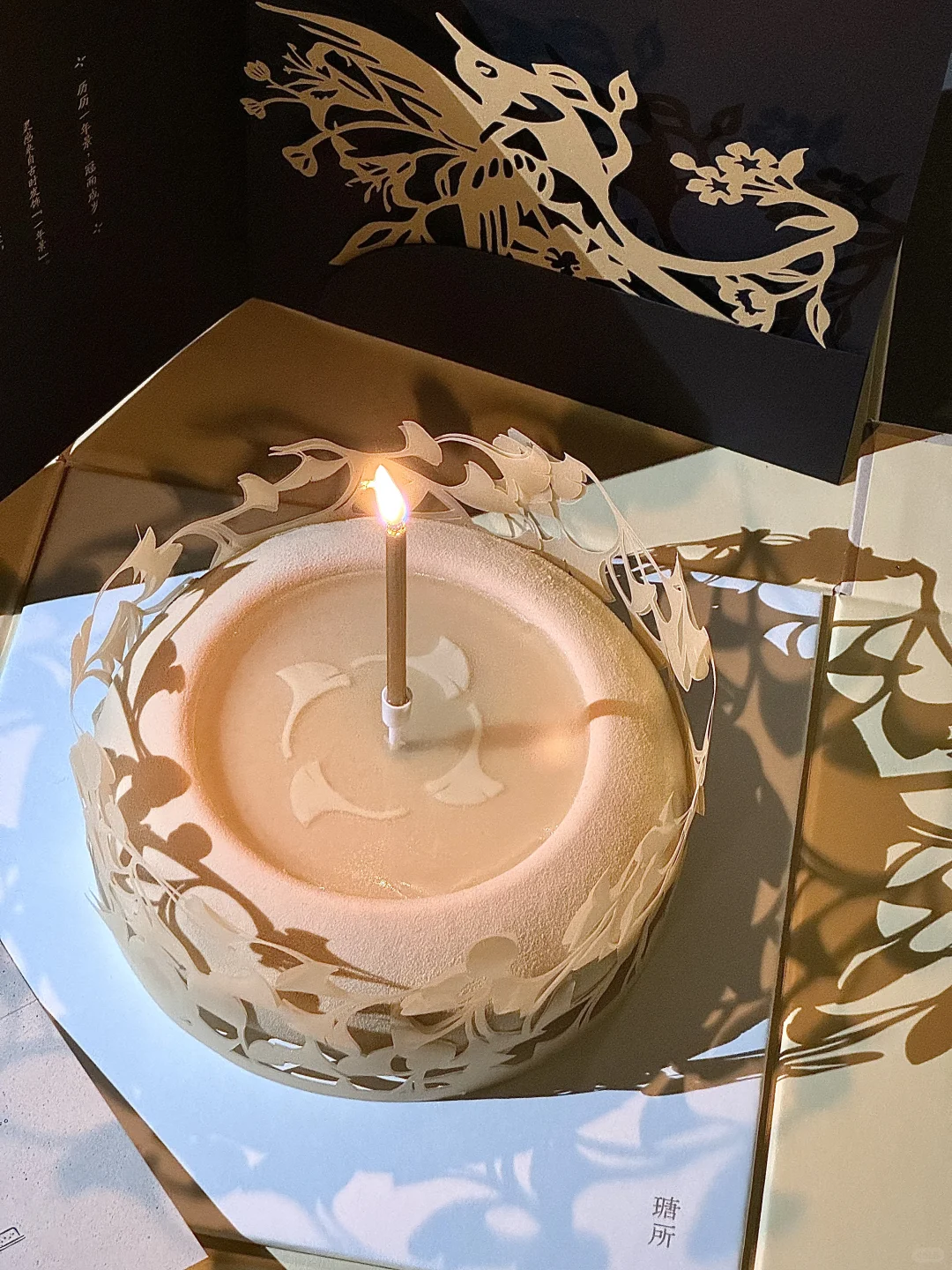 北京真的遥遥领先!!! 又有仪式感又好吃的漂亮蛋糕本人先替大家尝啦🥰 据说灵感来源于秋冬交替时 月照银杏簌影如雪的景象 点上蜡烛 映射出来的光影真的好温柔🎂 榛子栗子口味也很合适秋冬🍂 多层夹心 满满的坚果仁🌰 第一口下去就被惊艳到了🤩口感丰富 本人超爱里面的生日冠👑 寓意四季好景成冠 高级又精致 尊嘟太漂亮啦!拍照也超级出片📷