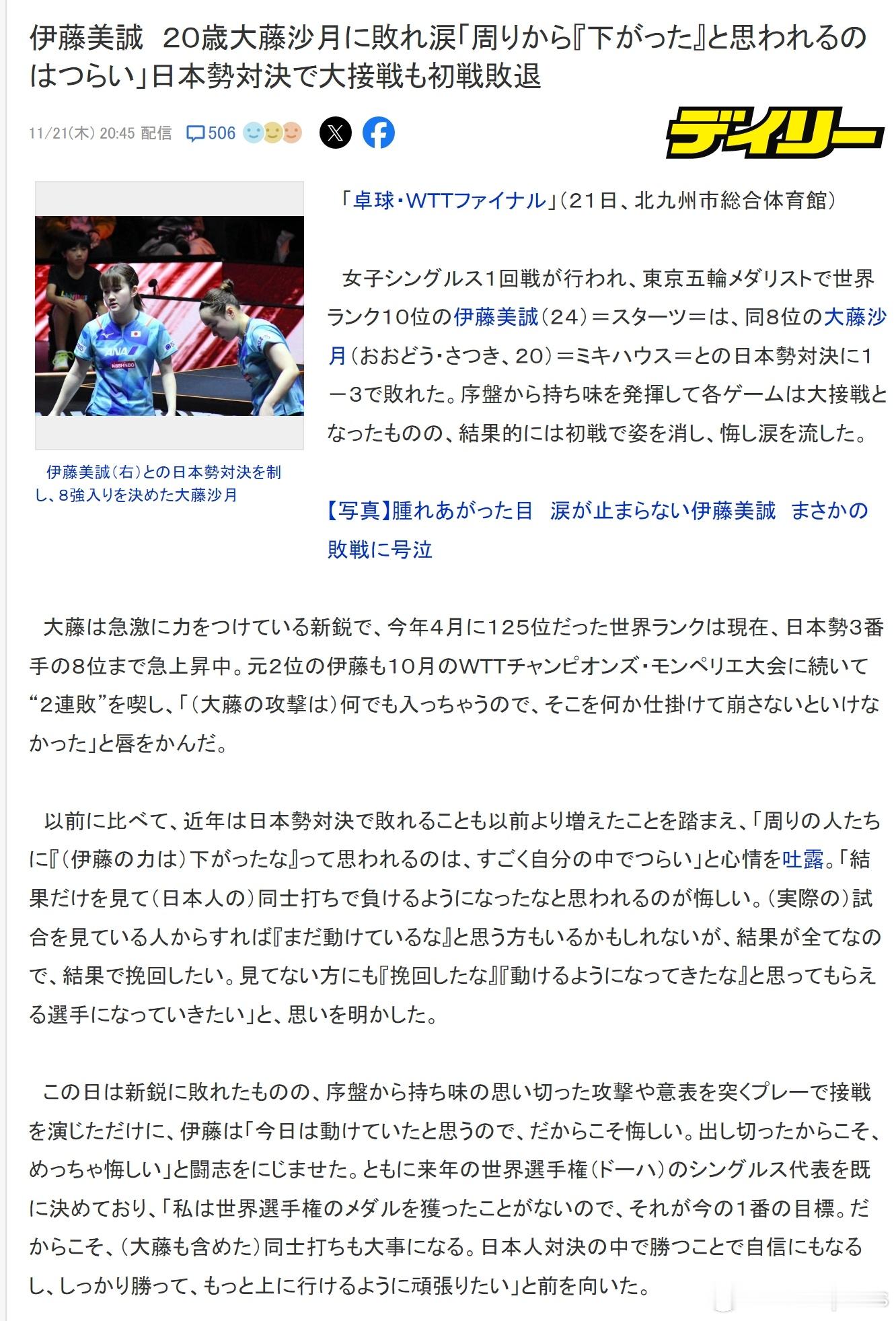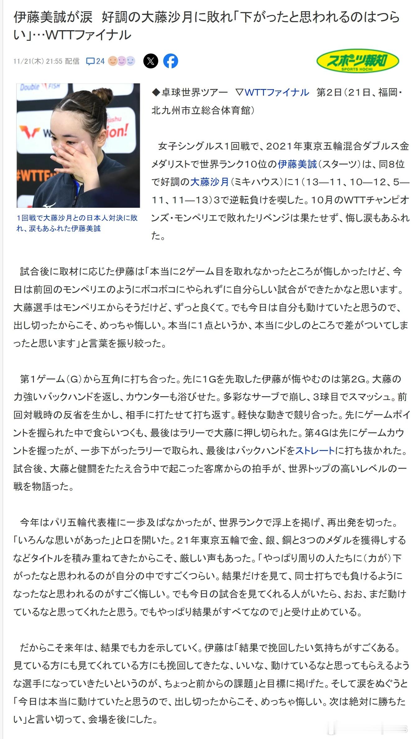 ——继10月的WTT蒙彼利埃冠军赛之后,连续2次败给日本新锐的伊藤美诚在赛后流下遗憾的泪水。