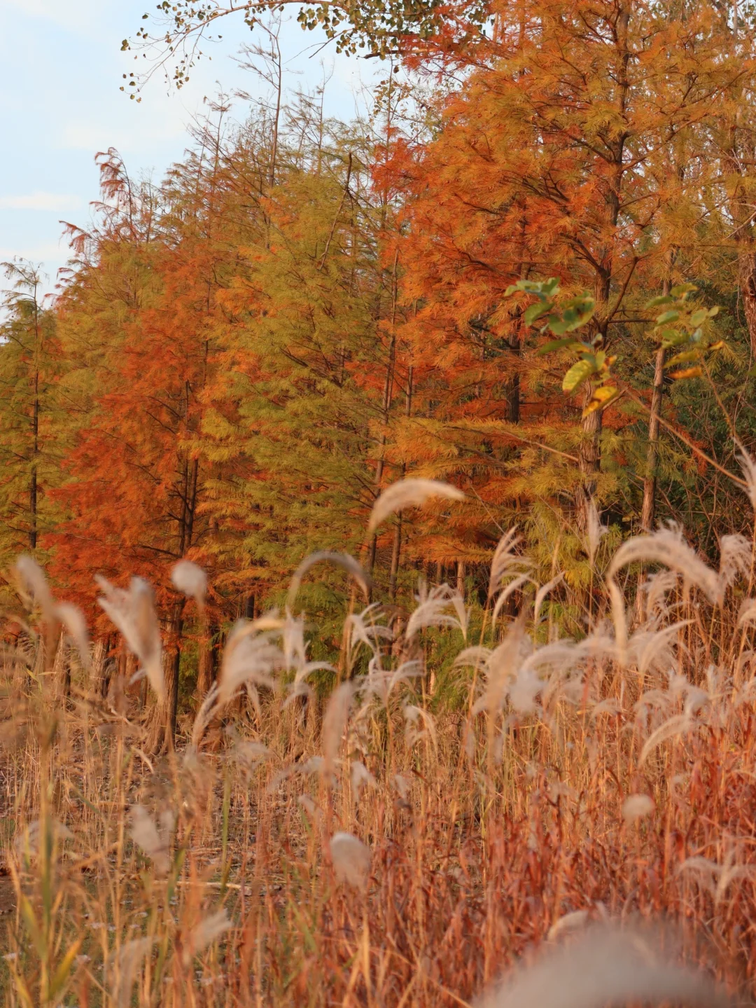 水库边的水杉红了 好好看、超好拍! 踩了一脚泥也很开心 ———