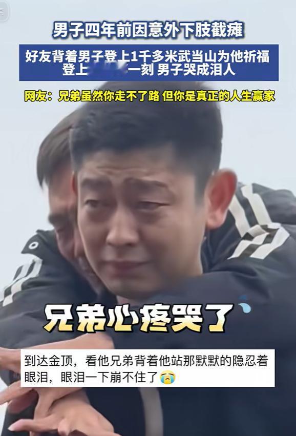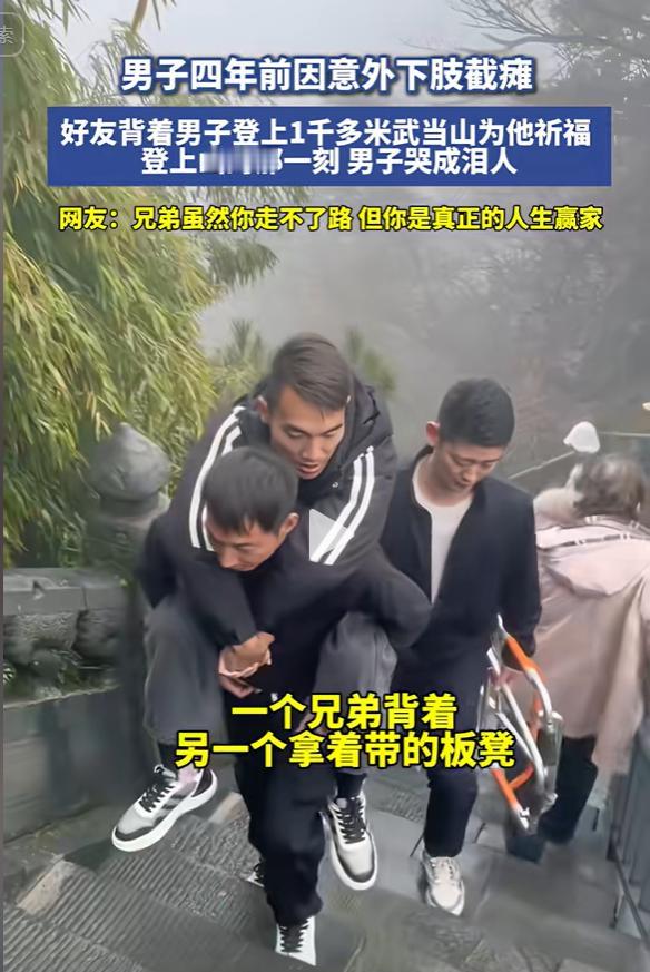 11月18号,湖北十堰,男子4年前高空坠落下肢截瘫,2好友背了他四五个小时,到武当山金顶祈福,男子大声哭喊“神啊,救救我”,好友心疼的给他擦眼泪,就连路人也泪流满面!网友:这一刻你得到了全世界的祝福! 11月18号,武当山,道教圣地,巍峨耸立。山间云雾缭绕,仿若仙境。然而,对于赵先生来说,这仙境般的景色,曾一度遥不可及。 四年前,他遭遇了一场高空坠落,生活似乎就此跌入了谷底。他遭遇了下肢瘫痪,这让他的生活轨迹发生了很大变化。 赵先生以前也是个充满活力的年轻人。他习惯了忙碌的生活节奏,习惯了用双脚丈量世界。 然而,意外发生后,他只能困在轮椅上,曾经熟悉的世界变得陌生而遥远。身体的每一寸变化,都伴随着难以言喻的痛苦。 早上起来、换衣服、吃饭,这些平常事儿现在变得好难。曾经轻而易举的动作,如今却需要付出巨大的努力。这种不适不仅让身体受苦,还让人心情难受。 赵先生现在得忍受不能自由的痛苦,就像被关在笼子里的鸟儿,心里想飞,但翅膀却动弹不得。 每当看到别人自由地行走,他心中总会涌起一阵酸楚和无奈。他尽力让自己看起来开心,主动配合医生,做康复练习,但心里的痛苦和矛盾只有自己知道。 每天坚持的复健训练,效果并不明显。赵先生的身体状况并没有明显好转,这让他对未来充满了迷茫和恐惧。 他开始怀疑自己的人生价值,怀疑自己是否还能像正常人一样生活。他将自己封闭起来,不愿与外界接触,甚至对一直陪伴在他身边的妻子衡女士也变得易怒和暴躁。 衡女士默默承受着这一切,她理解丈夫内心的痛苦,也心疼他的遭遇。她没轻言放弃,也没抱怨,就靠着关爱和耐心,一直陪着赵先生挺过难关。她给他加油打气,让他心情舒畅,帮他找回了生活的动力。 然而,命运的阴霾并没有就此散去。赵先生还是深陷在绝望的困境里,感觉无法逃离。就在这时,两位老朋友的出现,为他带来了希望的曙光。他们跟赵先生是老同学,认识二十几年了,关系好得像一家人。 他们一块儿长大,一起经历了开心和不开心的事情。他们了解赵先生的性格,也明白他内心的挣扎。他们知道,简单的安慰和鼓励对赵先生来说已经没有太大意义。他们需要做一些更实际的事情,来帮助他走出困境。 于是,他们想到了一个大胆的计划:背着赵先生登顶武当山。这想法挺大胆的,感觉有点儿不靠谱。武当山海拔一千多米,山路陡峭,有两千多级台阶。 对于普通人来说,攀登武当山已经是一项挑战,更何况是背负着一个成年人。然而,两位朋友并没有退缩。他们知道,这不仅仅是一次普通的登山,更是一次对友谊的考验,一次对生命的挑战。他们觉得,只要大家一心一意,肯定能搞定这个听起来很难的任务。 11月17日,他们开始了这场特殊的旅程。他们没告诉赵先生,一个台阶一个台阶地往上爬。山路崎岖,他们走得异常艰难。他们衣服都湿透了,累得骨头都要散架了。 为了途中轻松,他们拿个小板凳,路上累了就坐坐休息一下。走一段就歇会儿,给赵先生喘口气。他们互相鼓励,互相支持,没有一个人喊苦喊累。 四五个小时的艰苦跋舍,对他们来说,就像一场漫长的修行。他们靠双脚感受着友情的深度,汗水滋养着心中那颗希望的芽苗。 终于,他们到达了金顶。站在山顶,赵先生激动得热泪盈眶。他以前从没想过,自己会有机会再看到山顶那么美的风景。他张开双臂,拥抱这来之不易的时刻。 “神啊,救救我!”他情不自禁地喊了出来。这声呼唤,既是他对健健康康身体的向往,也是他对命运不公的不满抗议。 两位朋友也被这一幕深深地触动了。他们知道,赵先生的内心深处,依然渴望回到正常的生活。他们也相信,只要他不放弃希望,就一定能够战胜病魔,重新站起来。 赵先生的妻子衡女士也流下了感动的泪水。她挺感激那两位朋友对老公开心的关照,同时也为老公开心面对困难的样子感到自豪。 当时游客们被他们的故事触动了心弦,纷纷向他们送上了美好的祝愿。 信息来源:越牛新闻2024年11月18日关于《2好友轮流背截瘫男子登武当山祈福,登顶那一刻男子哭喊:救救我》的报道
