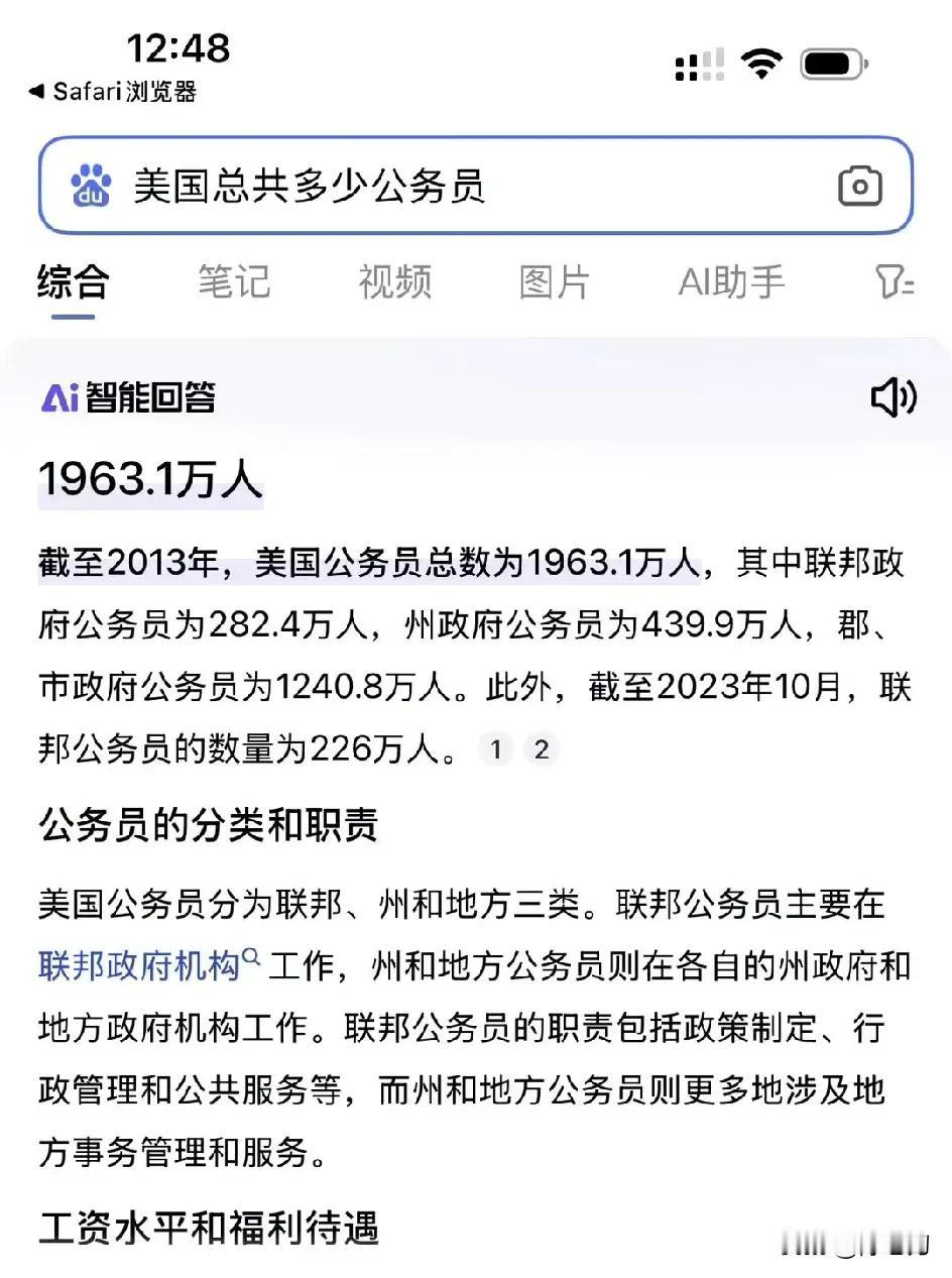 惊天大消息,中美两国谁的公务员多,真是颠覆我的认知,居然美国是遥遥领先 ~ 难怪特朗普成立效率部 ~ 难怪埃隆马斯克要干掉90%的公务员 ~ 数据如下 ~ 中国是700多万,美国是2000多万 ~ 按照我国的人口和领土的复杂程度 ~ 美国真是瑶瑶落后 ~ 解决效率问题,两个办法,一个是智能删减或者合并,一个部门负责几个事,一个人负责几个事 ~ 另外一个办法就是借助工具,例如上软件系统及规范流程 ~ 降低因为流程不规范和不透明导致的沟通问题 ~ 美国,已经开始臃肿,核心原因还是美国这个国家野心太大,操心的事情太多 ~ 你怎么看,感谢关注@陈老刀 ,聊聊咱老百姓感兴趣的话题 ~
