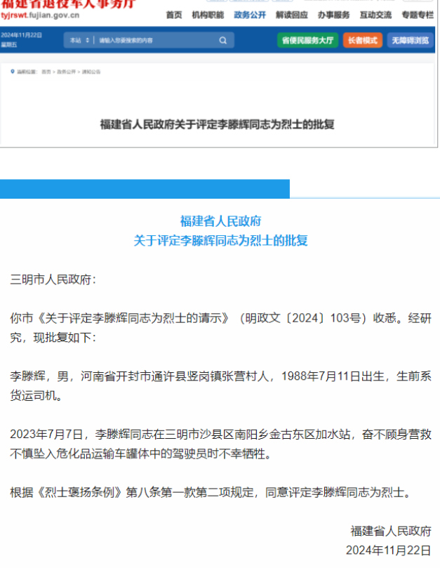 (信源:河南货运司机在福建救人牺牲,福建省政府同意评定其为烈士——2024-11-23 ·光明网)