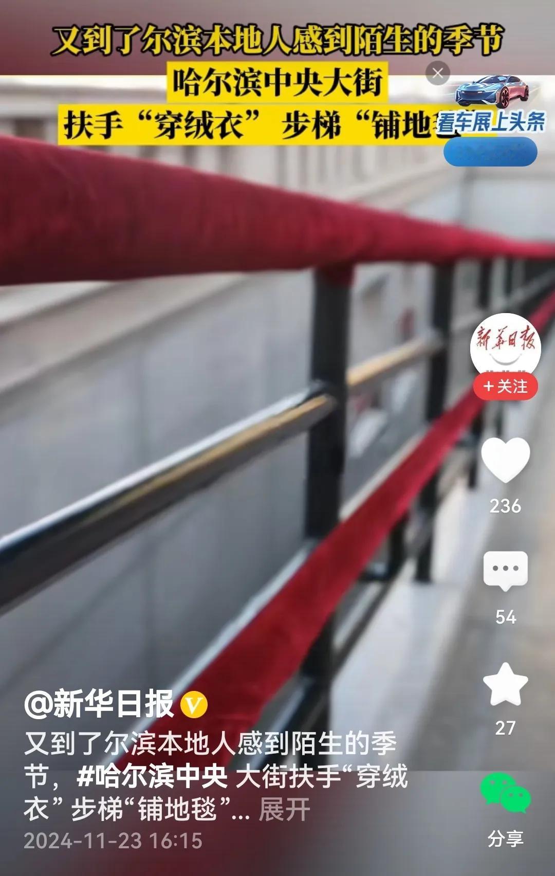 开始还以为哈尔滨整个中央大街都铺了地毯,看过视频其实不是,只是给步梯及扶手铺了地毯穿上了绒衣。 话说回来,哈尔滨为何给中央大街上的步梯和扶手铺地毯穿绒衣呢?个人理解,哈尔滨作为冰城,每到冬季会有大量游客来观赏东方小巴黎的神韵与冰雪美景,而中央大街更会游人如织,为防止天冷路滑发生意外精心准备的。从这个意义上说,哈尔滨此举有着很强的针对性时效性,不能不说哈尔滨这样做很合时宜。正所谓:步梯铺地毯,扶手穿绒衣。游客八方来,暖人又暖心。 (内容取材于网络)