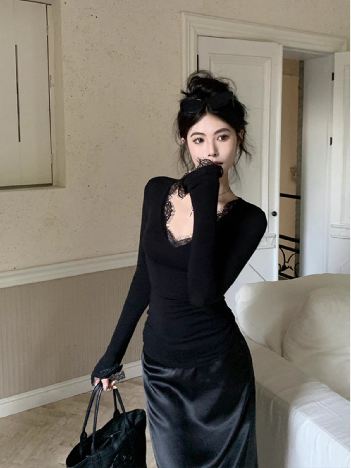 纯欲性感辣妹蕾丝v领修身长袖t恤女冬季