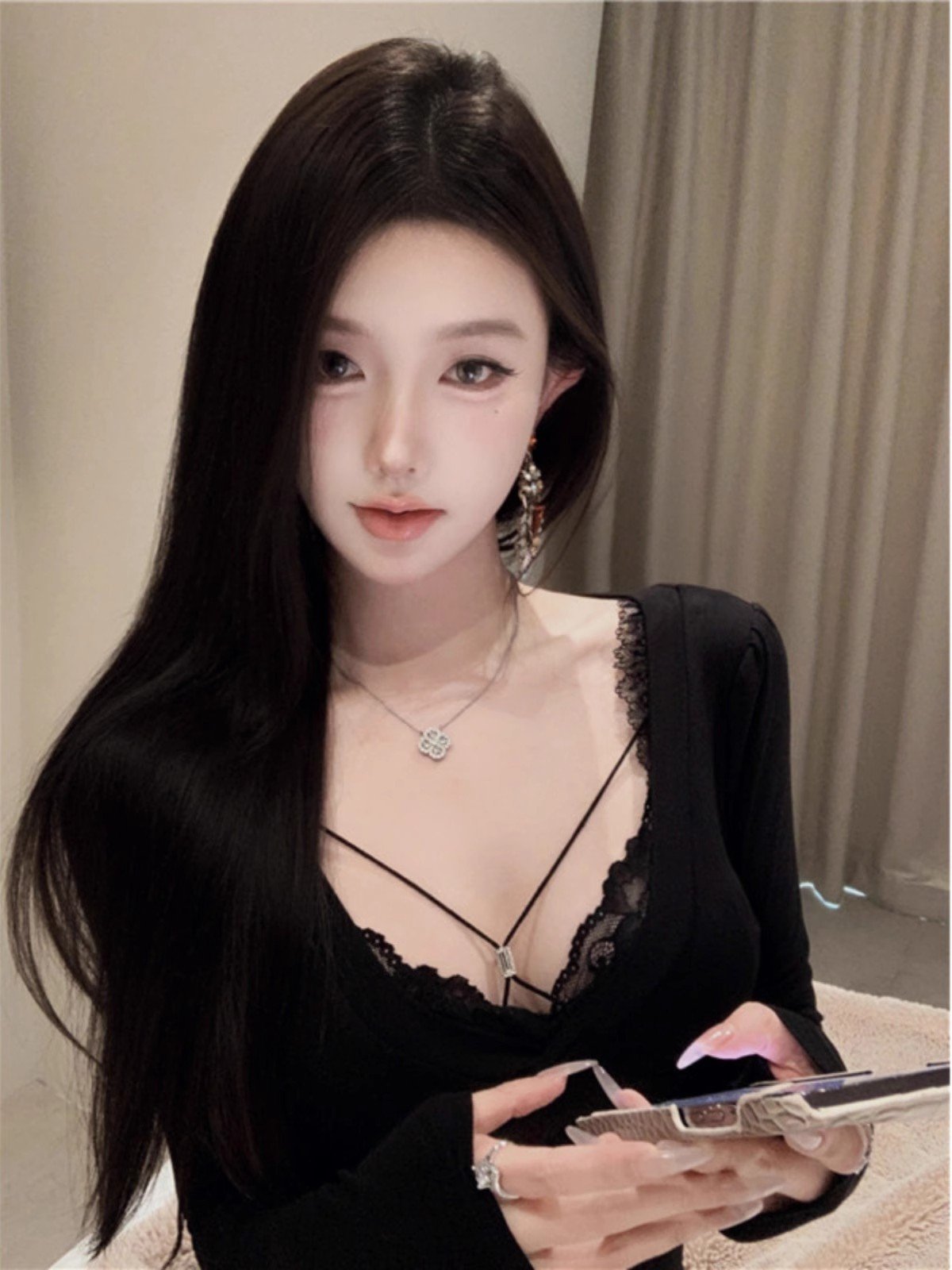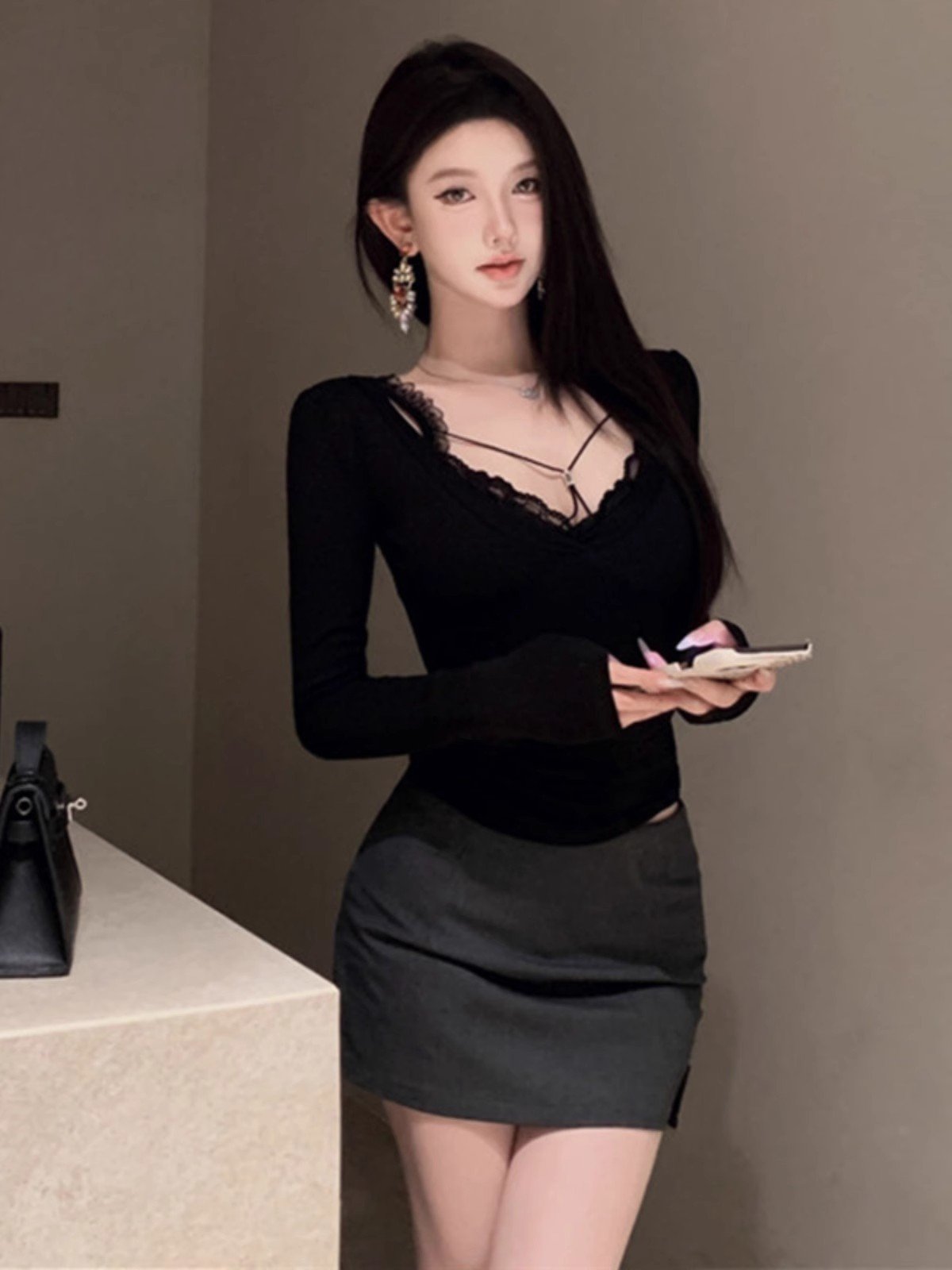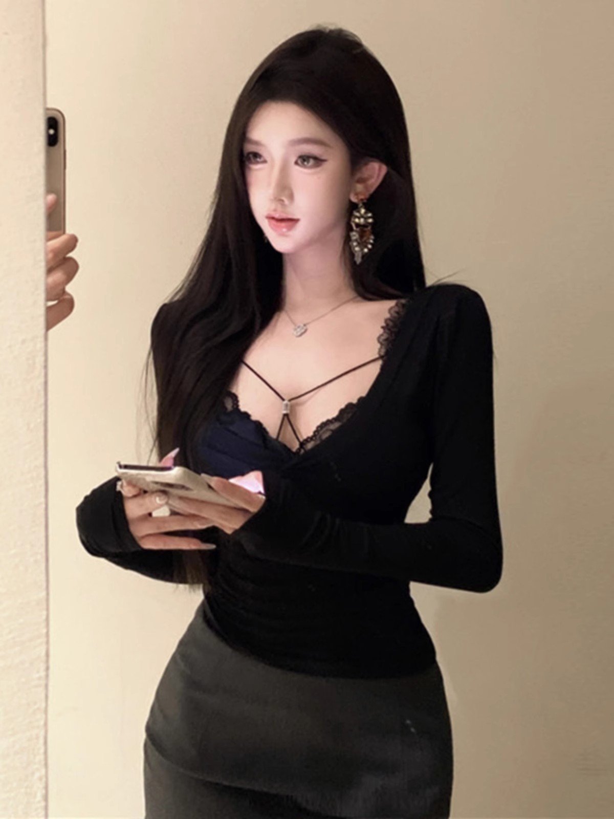 纯欲性感辣妹蕾丝v领修身长袖t恤女冬季