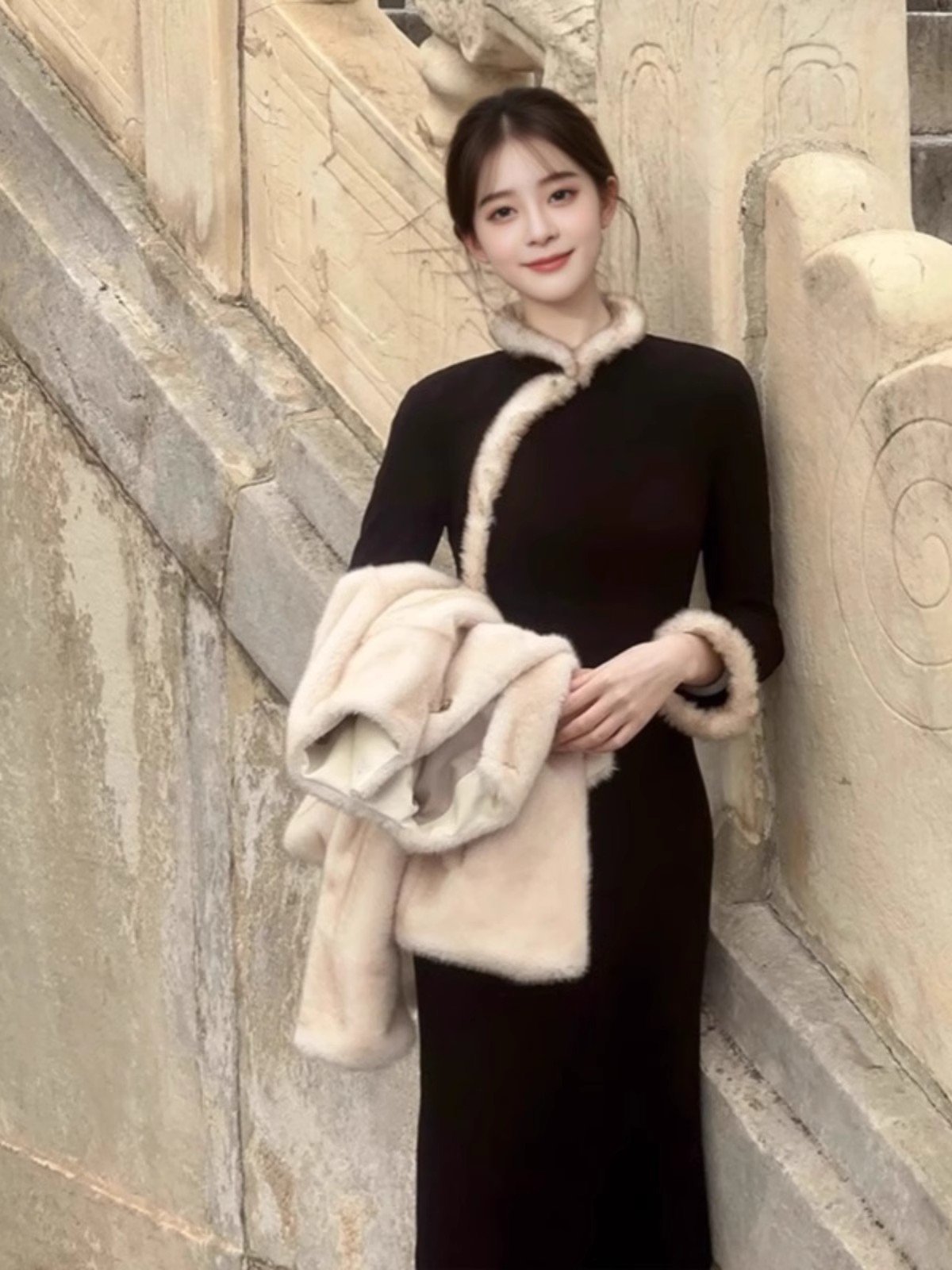 新中式国风加绒加厚改良旗袍连衣裙女冬季