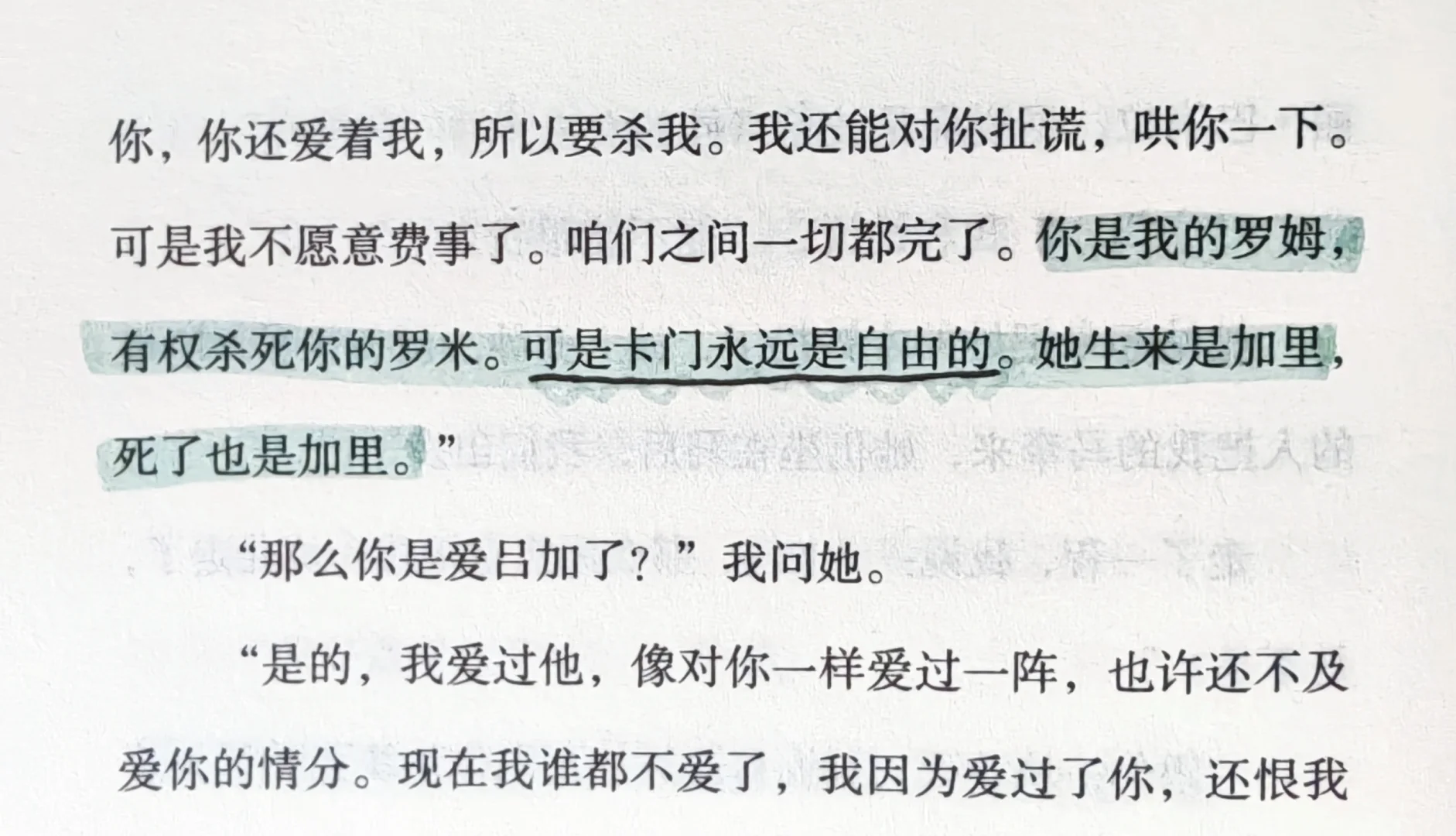为了她甘愿沦为强盗,为了她杀死情敌,为了她,也将彼此葬送。可是卡门啊,她是自由的卡门,你爱上的不正是她那种自由不羁吗?