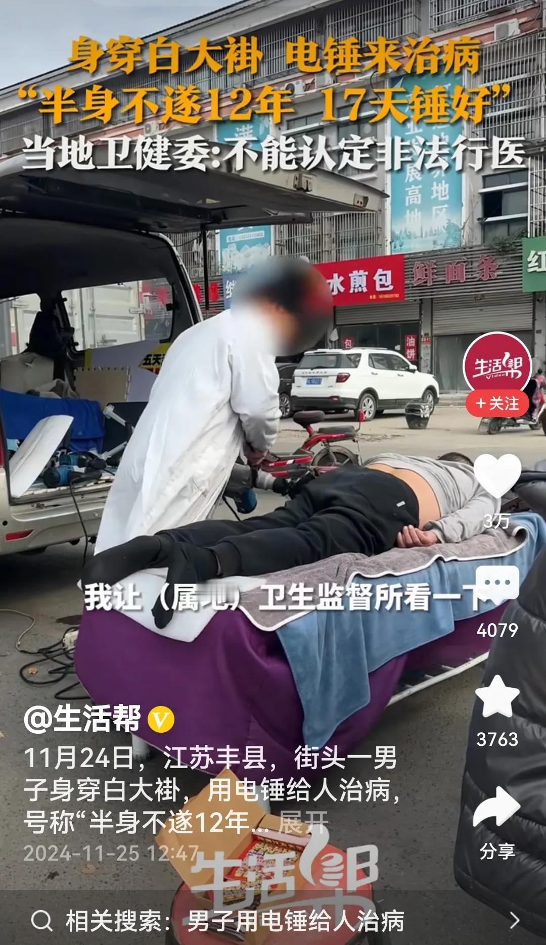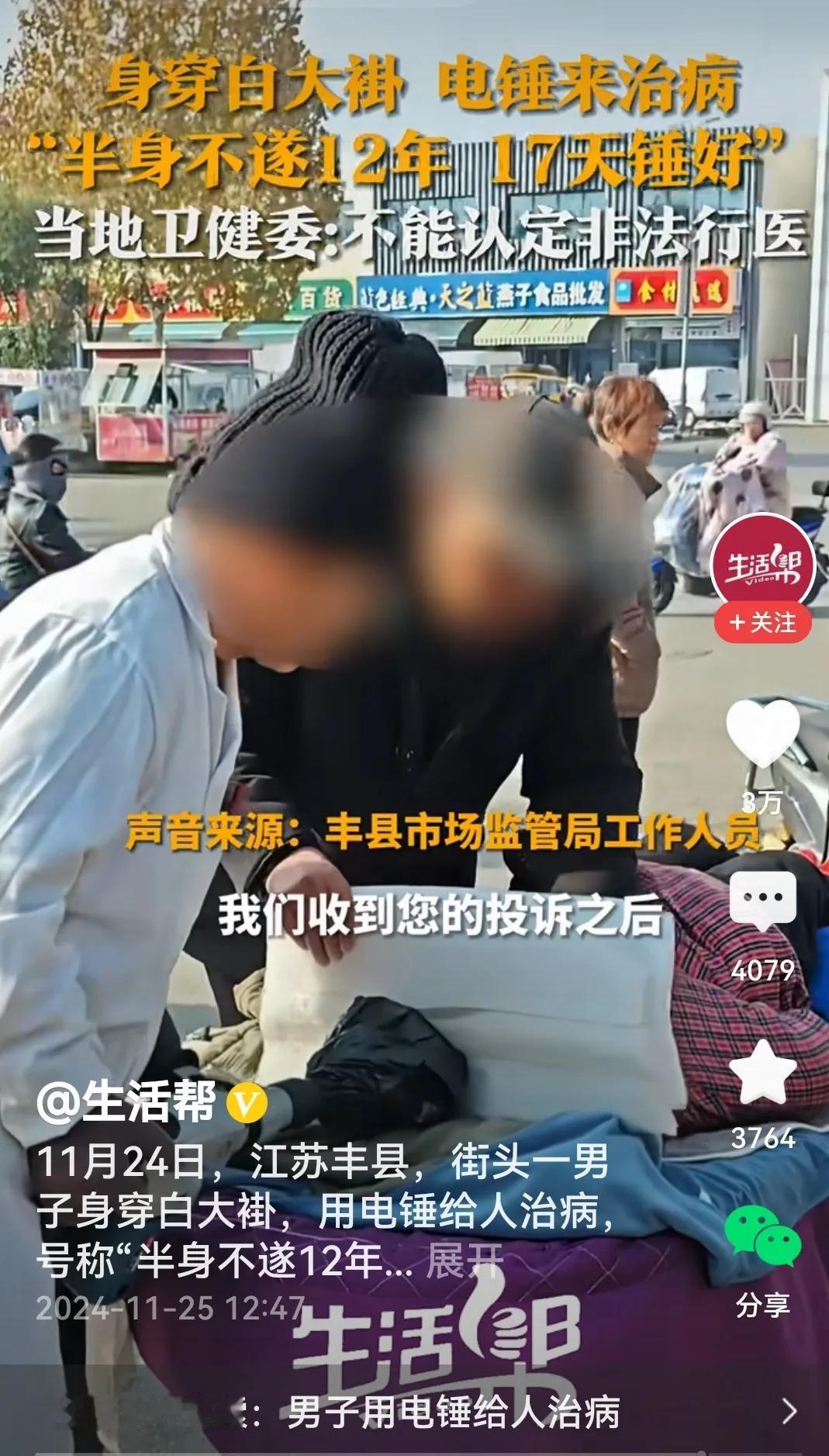 震撼。 视频里看到,街头上男子穿着白大褂拿着电锤在给有需要的患者治病,一边治还一边介绍电锤治病的疗效。 话说回来,印象里电锤是一种电动工具,用来装修或破墙的“好帮手”,可以用来治病吗?没试过不好说,总的感觉两个字——震撼,正所谓: 电锤治病很奇妙, 来尝试的真不少。 若问此法行不行? 不看广告看疗效。 (个人观点,内容取材于网络)