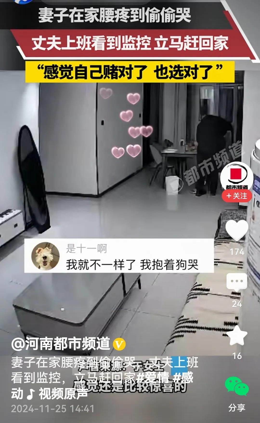 老公看到后立即回家 暖心的一幕。 视频里看到,妻子腰疼,丈夫上班不放心查看家里的监控,看到妻子默默的落泪,丈夫立马赶回家里,默默的把妻子抱在怀里,妻子被无言的爱感动,腰疼似乎减轻了许多。正所谓: 爱的语言是关心, 爱的语言是体贴。 爱的语言是挂念, 爱的语言是细节。 于无声处见真爱, 大爱所至渺无痕。 真水无香亦留香, 嫁人就嫁这样人。 (内容取材于网络)