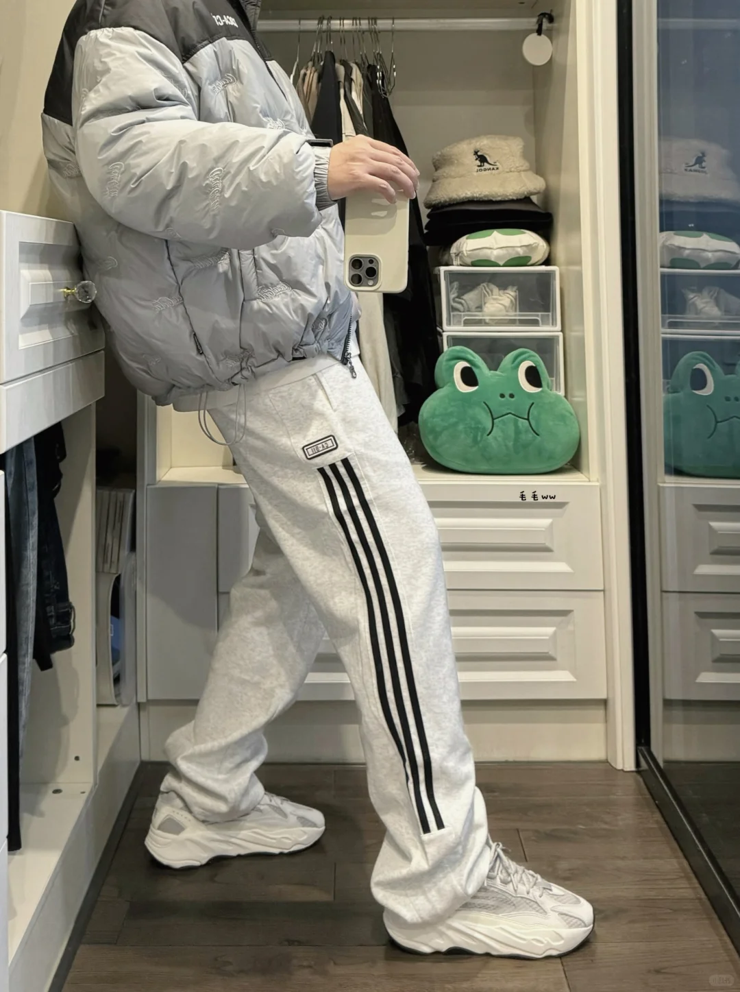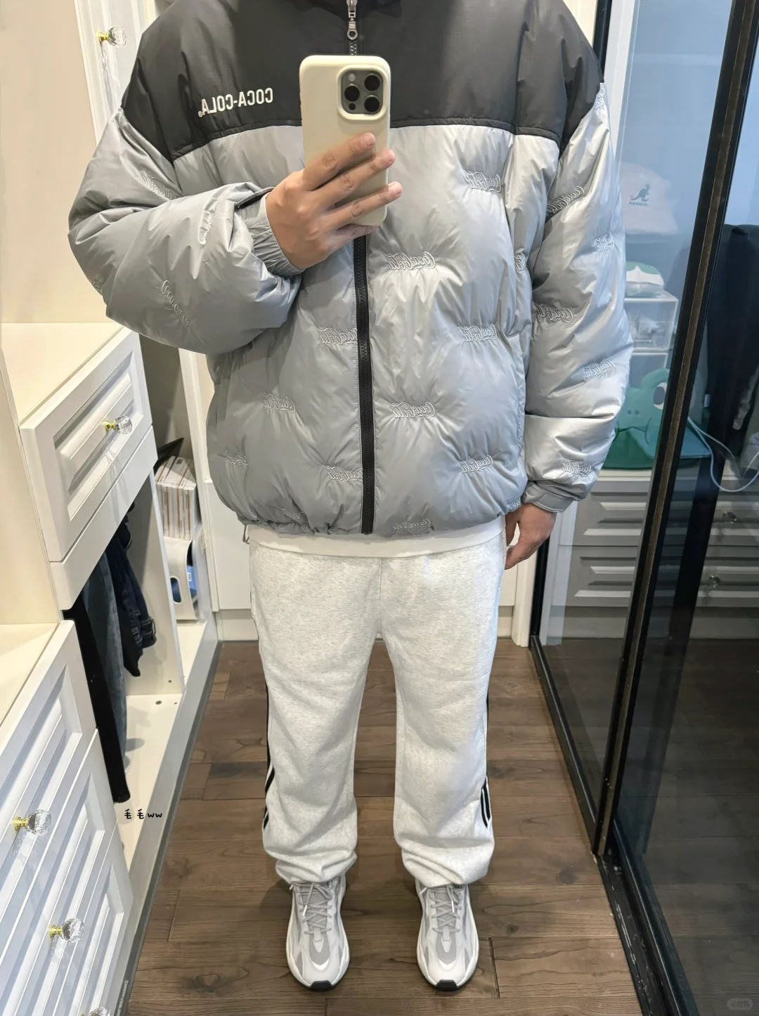 -凛冬将至,低饱和度色系,冬季羽绒服穿搭;主打冷色调,花灰、古白、液银 . -蓬松的羽绒服也可以好看的同时显瘦,侧条纹卫裤搭配老爹鞋,略带一份复古 . —————— . ✏️本人178cm75kg 球鞋尺码265mm(正常EU42) . 💭以上均为我个人观点,不喜勿喷,欢迎讨论。