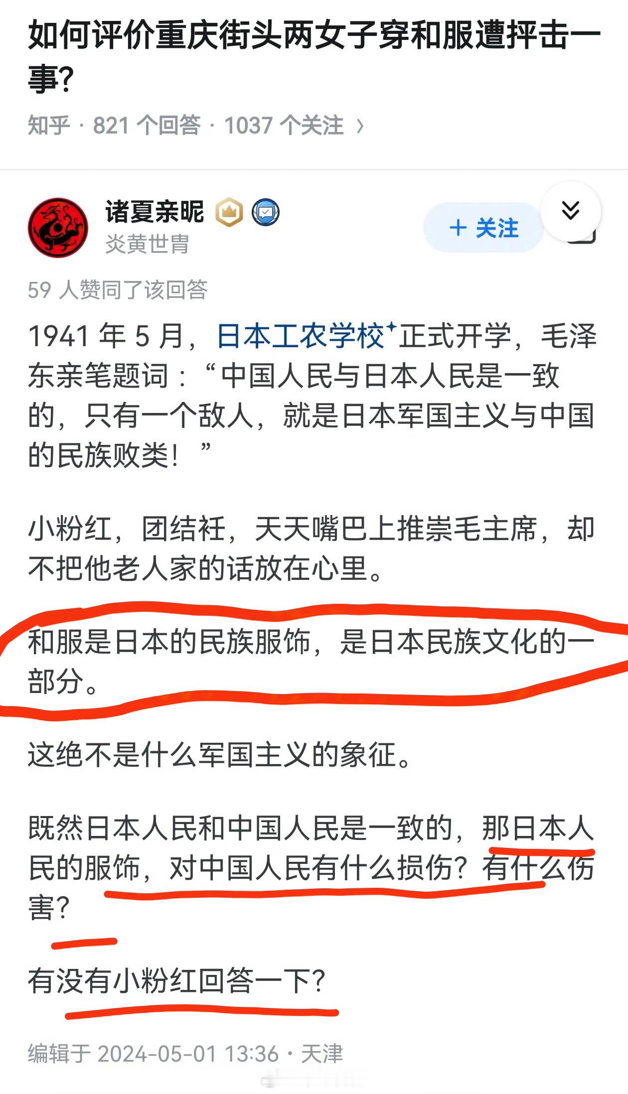 网友投稿:李子柒穿清代服饰不行,但有人穿和服就行。