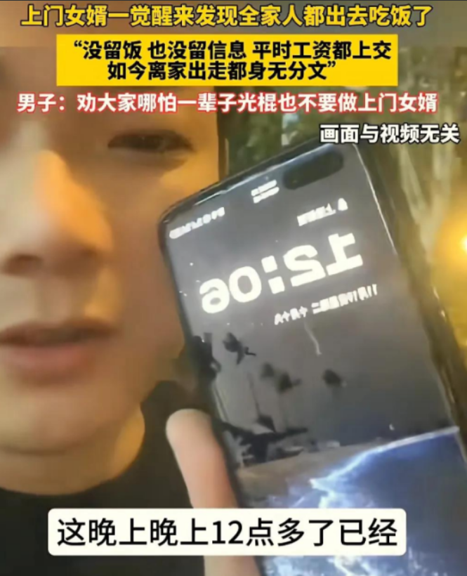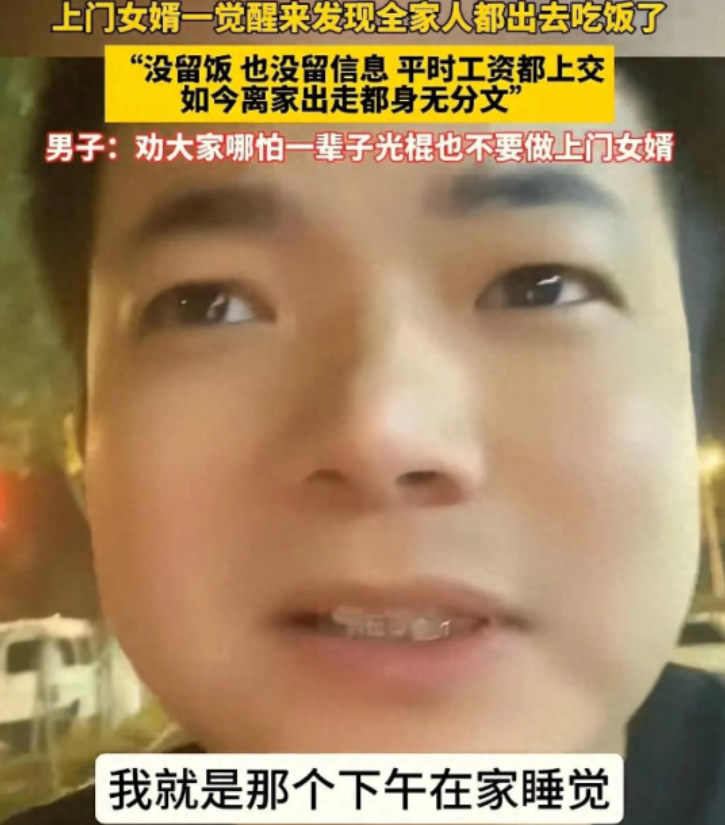湖北,一男子当上门女婿,每月工资全部上交,零花钱都是妻子给的。一天下午男子睡醒后,发现全家人都出去吃饭了,唯独没有叫他。男子觉得没有得到重视,一气之下离家出走,可因身无分文,只能住地下车库。 “奉劝大家,宁愿打一辈子光棍儿,也不要当上门女婿。”究竟是怎样的泣不成声,才会让李先生发出了这样的忠告。 李先生结婚那一天,是他人生中最高光时刻,此后,身为上门女婿的他在家里就好像一个边缘人、透明人。 每月工资到账后,全部上交给妻子,而家里的琐碎杂事全归李先生负责。有时,就连李先生需要一点零花钱,都得仰仗妻子的鼻息。 李先生觉得,他在这个家里就是免费的长工,不,连长工都不如。 11月20日,李先生下班后和妻子一家打了个招呼,倒头就睡了,他实在是太累了,妻子听完李先生的话后看了他一眼,没说什么。 直到晚上九点多,李先生睡醒时,发现家里只剩下了他一个人。 立时,莫名的委屈涌上心头,他知道这是全家人又一次背着他出去了,他就是这个家里的透明角色,可有可无。 稍微缓了一下,李先生给妻子打了个电话,还没等他开口,电话那边就传来了推杯换盏、觥筹交错的聚会声音,李先生问:“你们吃饭怎么不叫我呢,是嫌我丢人吗?” 妻子本来还打算敷衍他一句,听到这话后直接挂了电话。 李先生再也睡不着了,就这样默默地坐在房间里发呆,等到妻子回来后,两人说着说着便大吵了一架,气极的李先生摔门而出到了客厅。 见到女婿出来后,在沙发上坐着的岳父岳母以一种很冷淡的眼神看了他一眼,便不再理会了。 李先生感觉到了莫大的耻辱,他在这个家里连个长工都不如,索性直接离家出走。 当时已经是晚上12点多,李先生兜里没有钱,手机里也不过20多块钱,离家出走的他发现、竟然连个落脚的地方都没有,无奈的他只能在小区的停车场里凑合了一夜。 但如今这个天气,李先生又穿了一件单衣,身上不住地在发抖,他多么希望妻子能够打来一个电话问一声,但直到次日早晨都没有。 李先生内心的失望可想而知,但因为太冷了,他还是回到了家,准备拿些衣物,他回来后,却发现妻子已经将他的衣服全部打包起来,一件都不许带走。 李先生的心彻底凉了,又回到了停车场,好在刚巧有位保洁大爷看他比较可怜,便拿了一件破旧的棉大衣给他。 对于此时的李先生而言,一个陌生人都比妻子一家更有人情味儿,他这个上门女婿真的连一丝价值都没有。 城市漫天霓虹,万家灯火,却没有他的容身之处,李先生准备回老家了。 最后,他发出了文章开始的忠告。 【信息来源:咸宁视讯—上门女婿发现全家出去吃饭没叫上自己,一气之下离家出走 —发布于 2024-11-23 22:07】