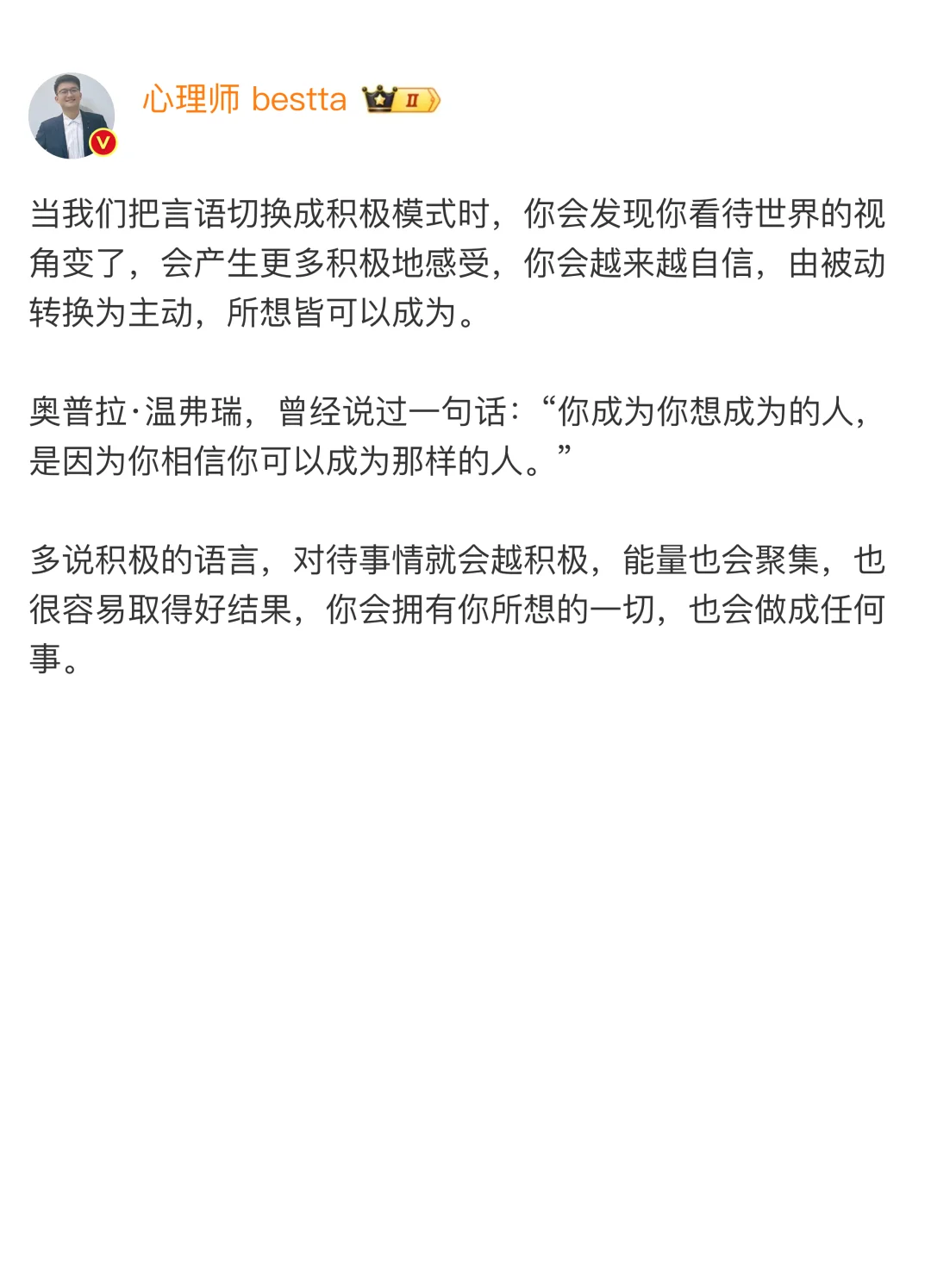多说积极的语言,对待事情就会越积极,能量也会聚集,也很容易取得好结果,你会拥有你所想的一切,也会做成任何事。