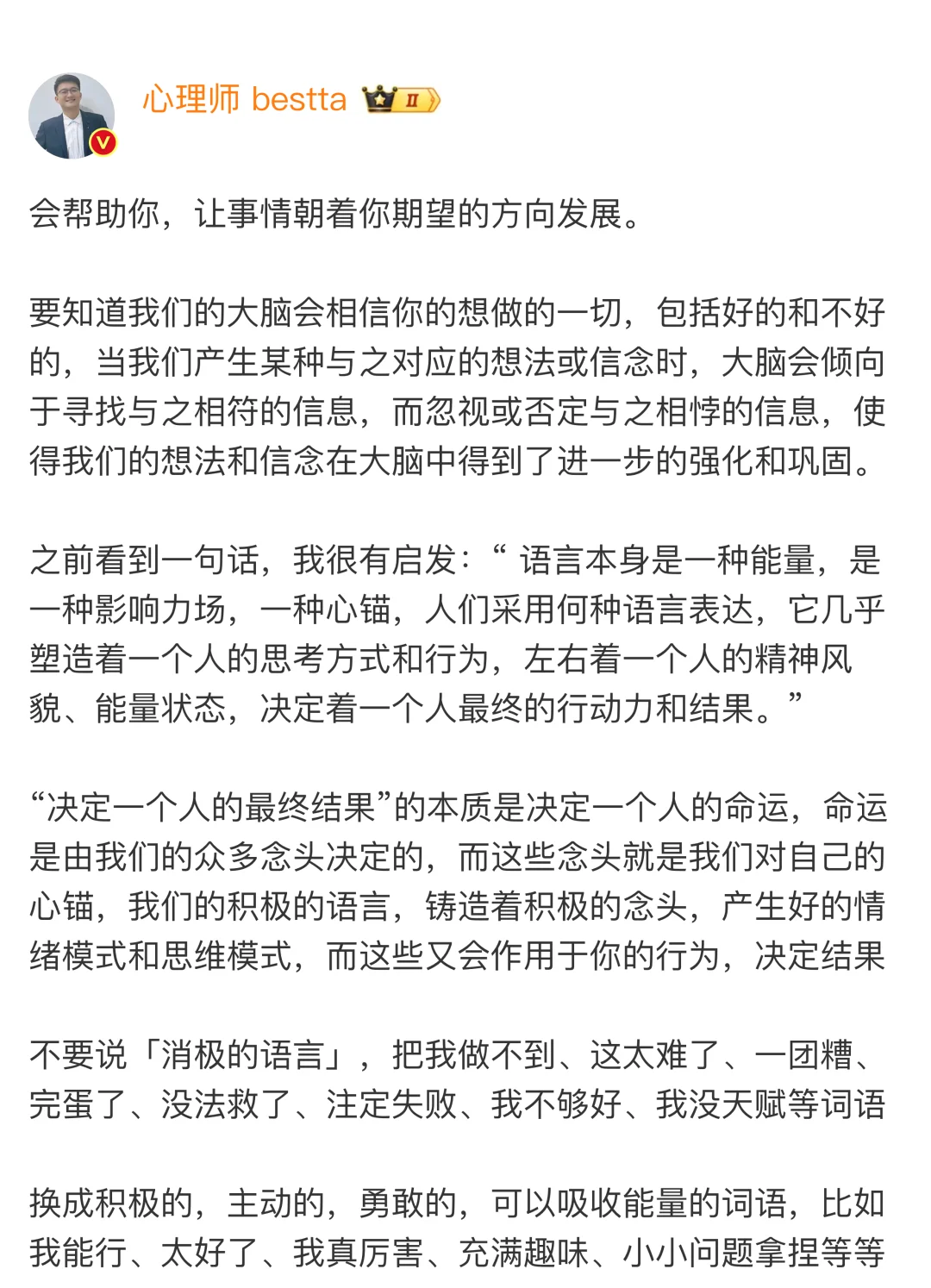 之前看到一句话,我很有启发:“ 语言本身是一种能量,是一种影响力场,一种心锚,人们采用何种语言表达,它几乎塑造着一个人的思考方式和行为,左右着一个人的精神风貌、能量状态,决定着一个人最终的行动力和结果。”