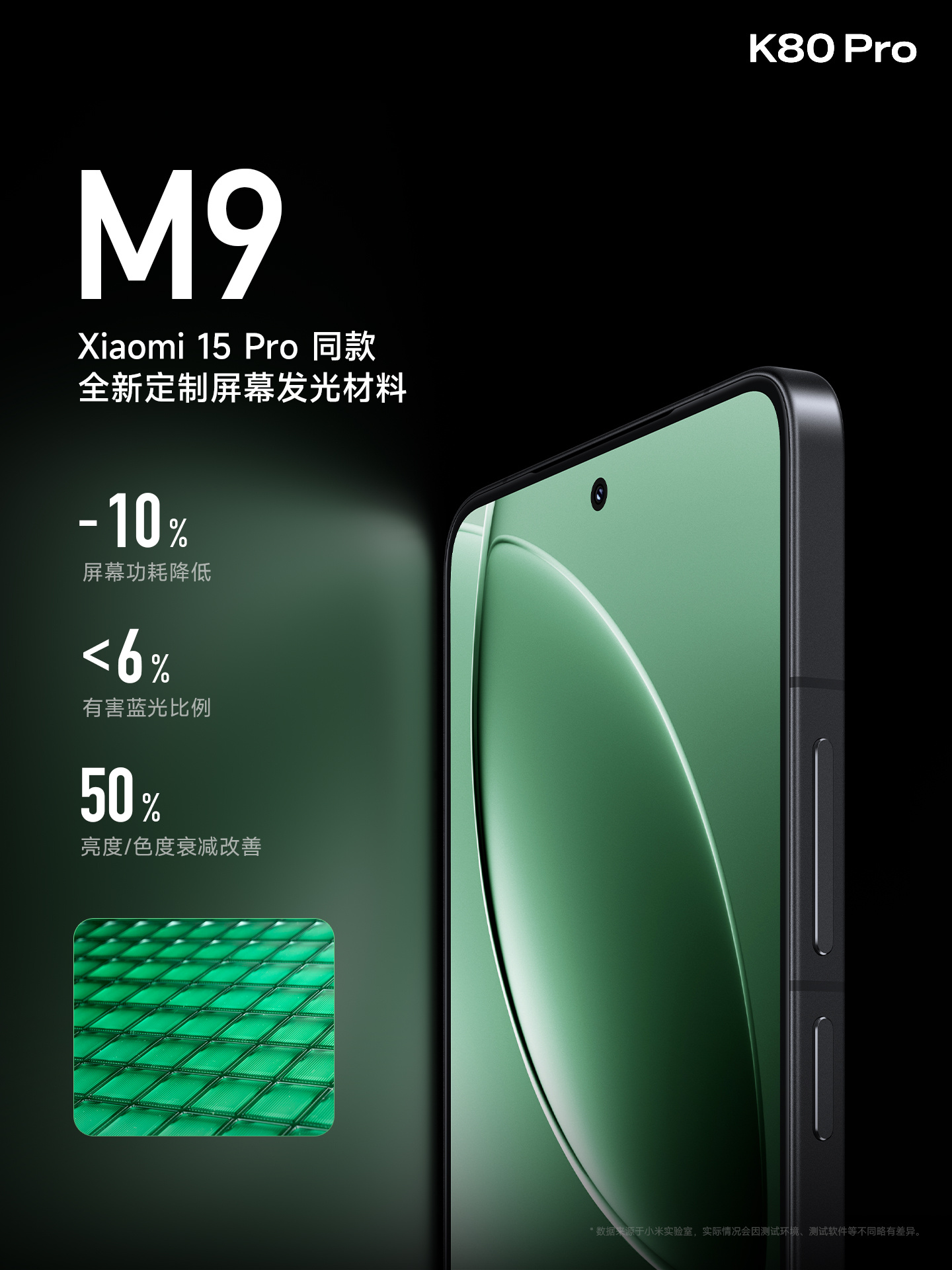 红米K80发布会 K80 Pro 这次全力打造了 2K 新国屏,挑战顶级视效。定制的 M9 发光材料,加上双微腔结构,提升了屏幕的表现。亮度方面,3200nits 超级阳光屏,在强光下也能清楚显示。色彩方面,采用了专业原色屏,并且经过专业调校,保证多屏同色。