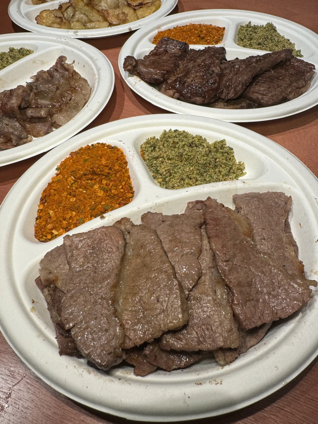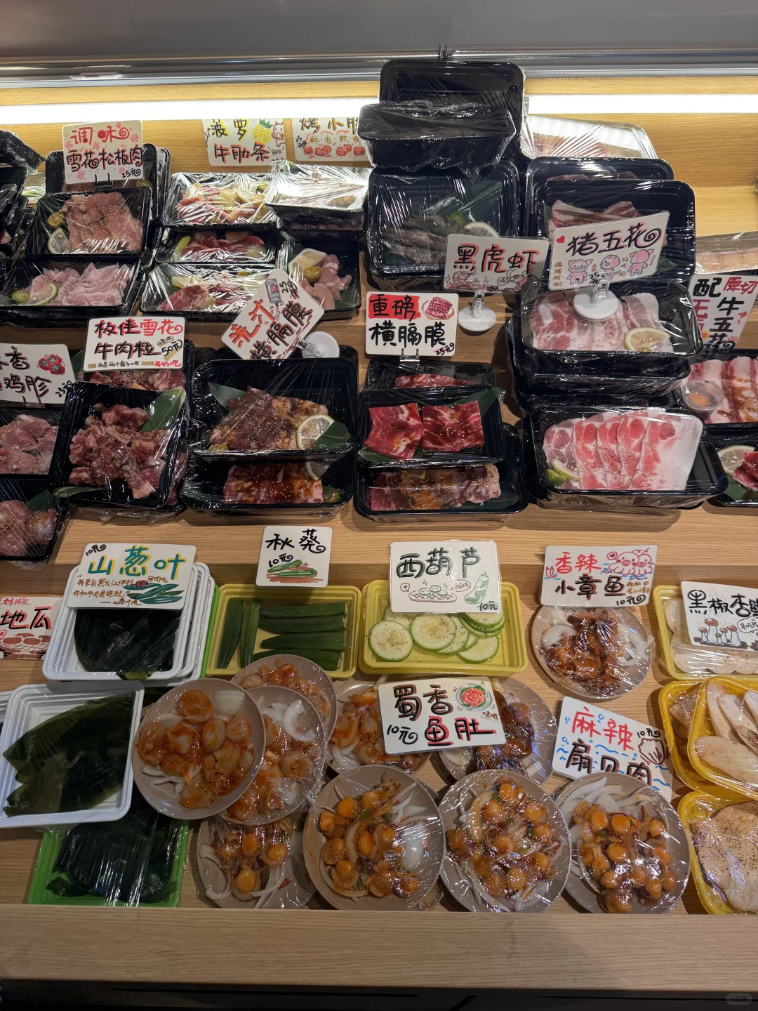 大行宫附近新开的是自选烤肉酒场 想吃什么自己拿,肉的品质都很不错,店里装修也特别温馨,非常有氛围。肉大部分都是25r一盘,横膈膜、牛肋条…都很不错。还有烤年糕和拉面。