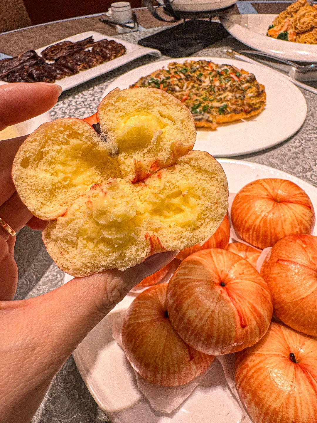 里边就是奶香奶香的奶黄馅 大人小孩都爱吃~