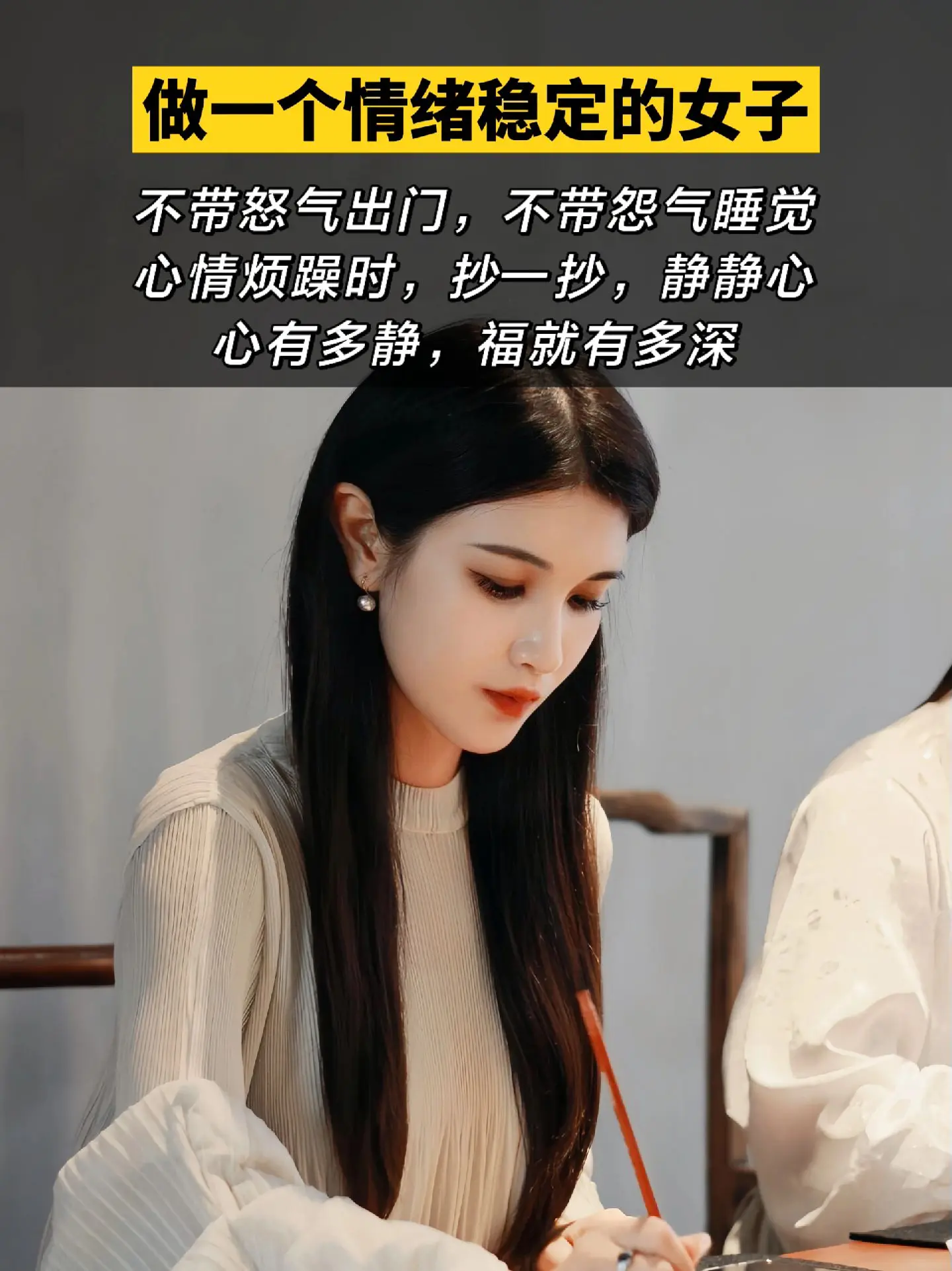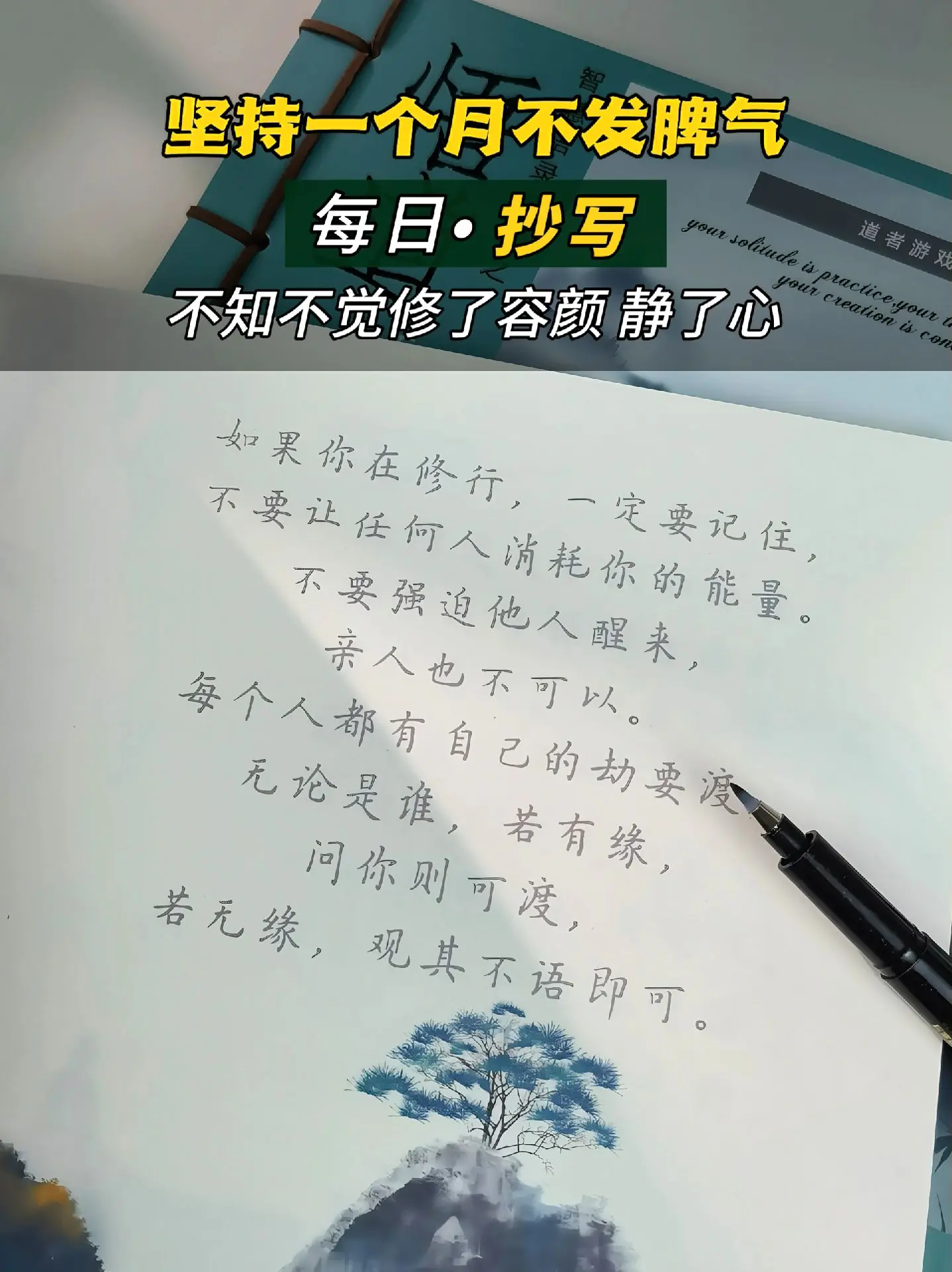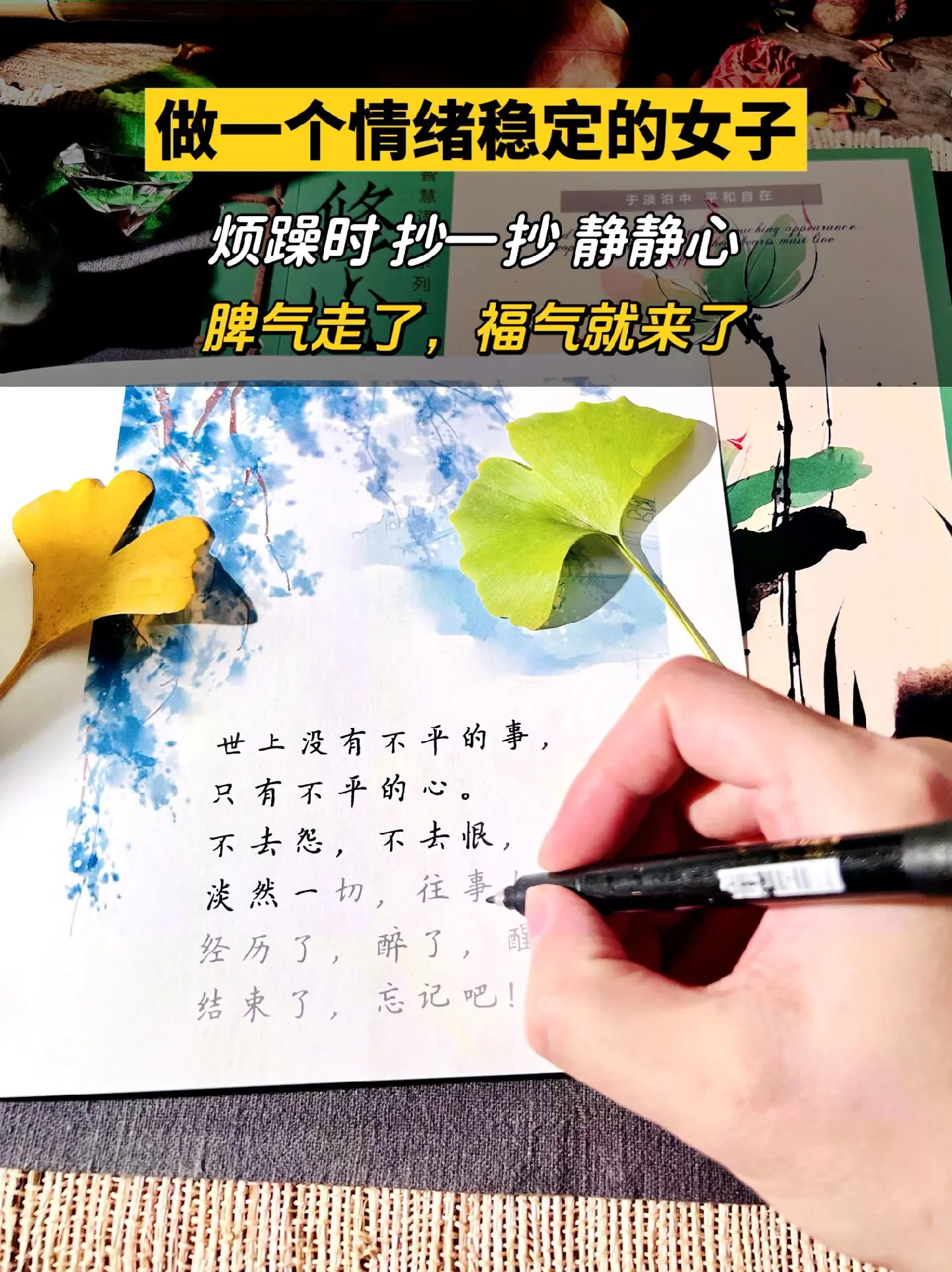 脾气走了,福气自然就来了~人要有翻篇的能力, 不依不饶就是画地为牢; 这个世界没有真正快乐的人, 只有想的开的人; 要永远相信,所有的山穷水尽, 都藏着峰回路转; 就算是一地鸡毛, 也要搓出一个鸡毛掸子; 感到烦躁或想发脾气的时侯, 不妨写写字,静静心; 平复下内心,让自己回归安宁; 别让脾气挡住了你的福气, 心有多静,福有多深。