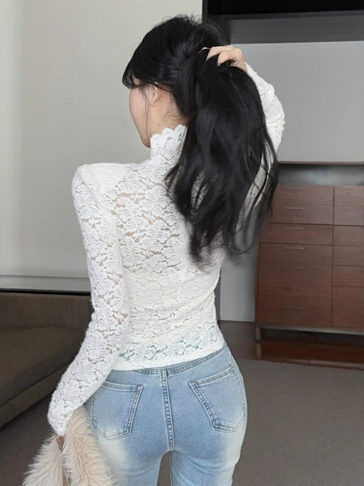 性感白色蕾丝半高领打底衫打底衫女冬季内搭