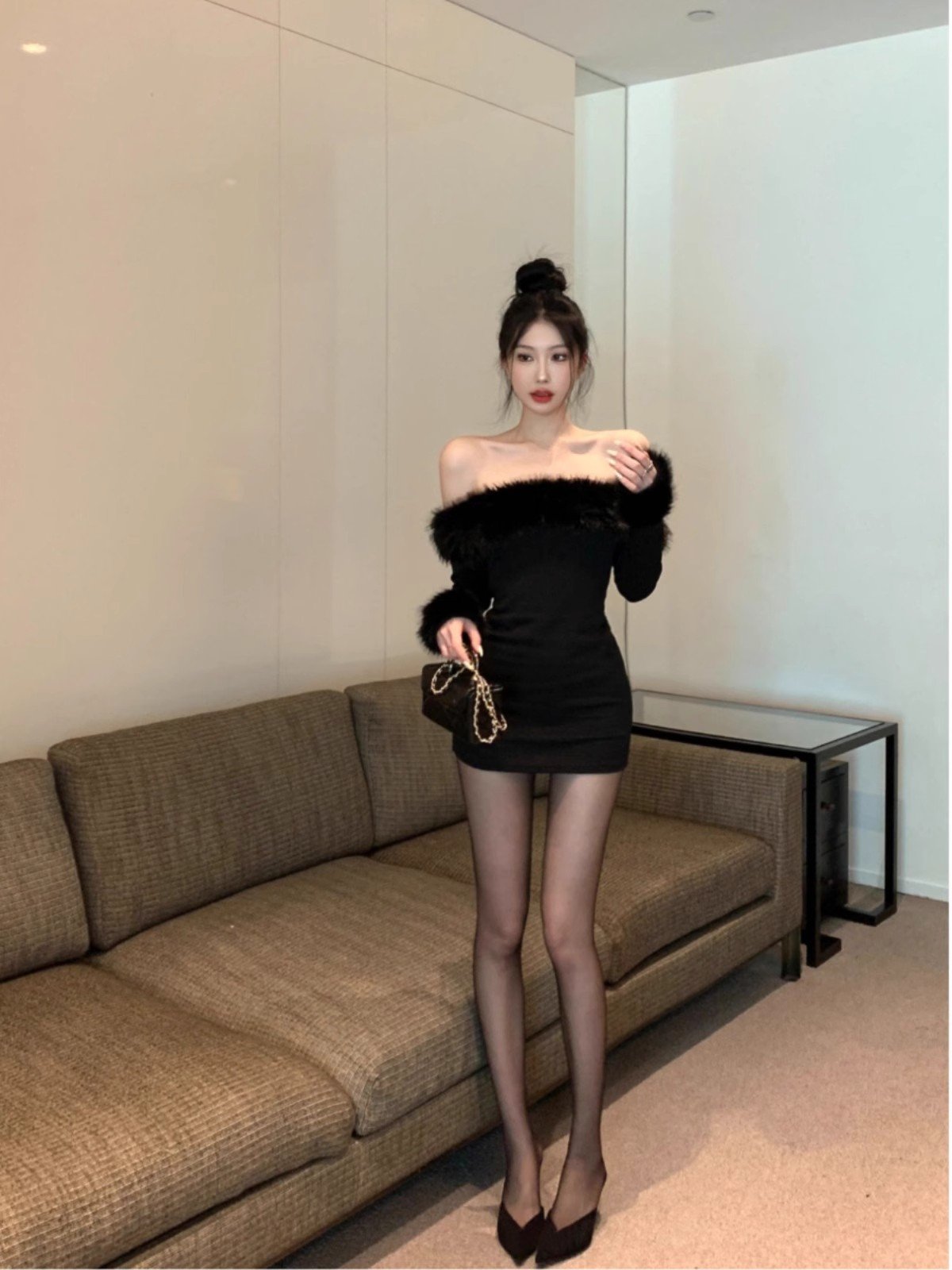 性感黑色一字肩抹胸毛毛内搭连衣裙女冬季