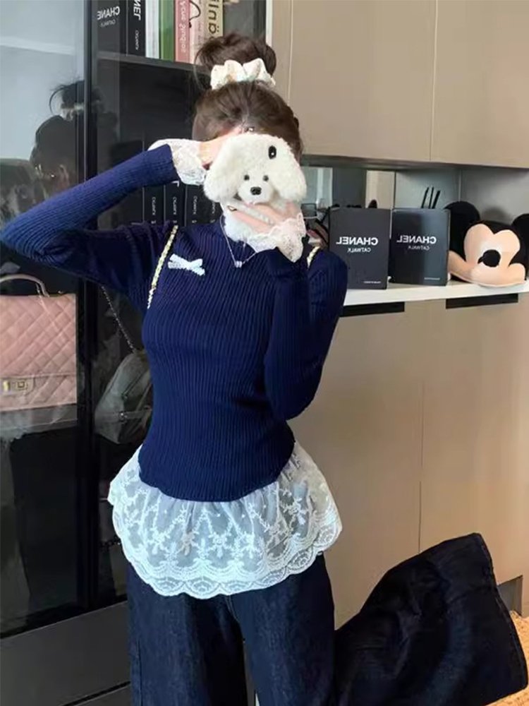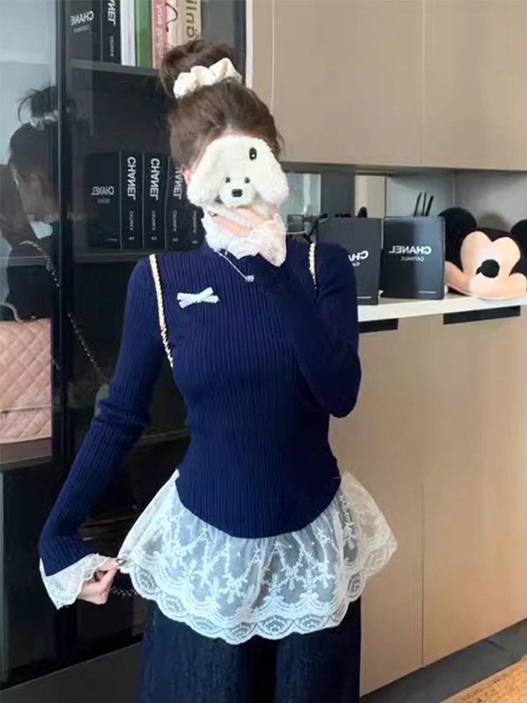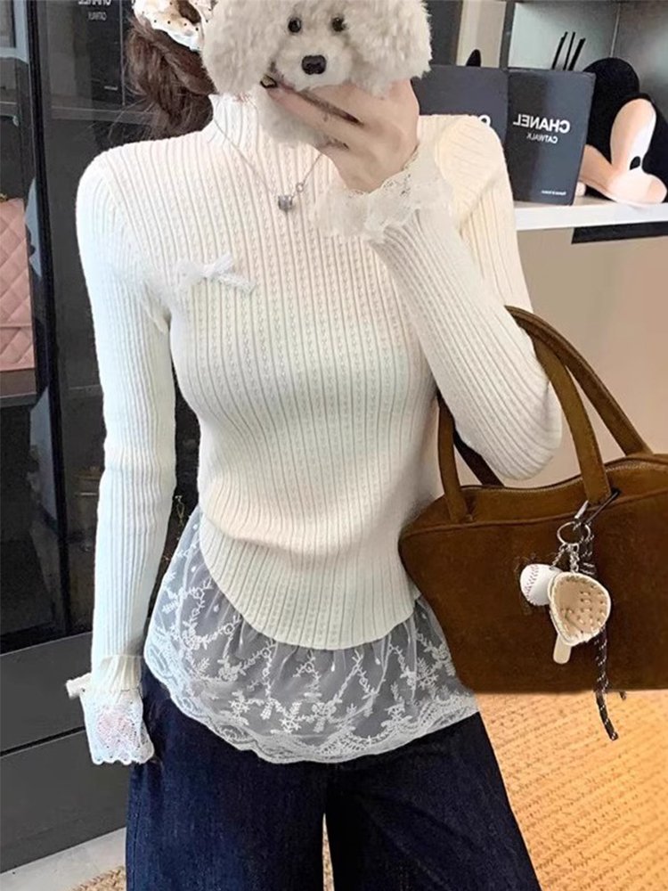 纯欲性感蕾丝拼接半高领长袖t恤女遮屁股