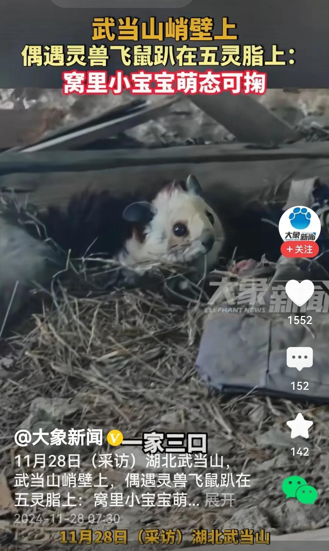 还真是,难得一见的飞鼠趴在武当山千米峭壁上。尤其飞鼠宝宝,瞪着两只明亮的大眼睛,很好奇的打量着这个五彩缤纷的世界。还有那小眼神儿小表情,把一切融化了。 正所谓: 会当凌绝顶, 一览众山小。 莫是天上来? 武当来落脚。 (内容取材于网络)