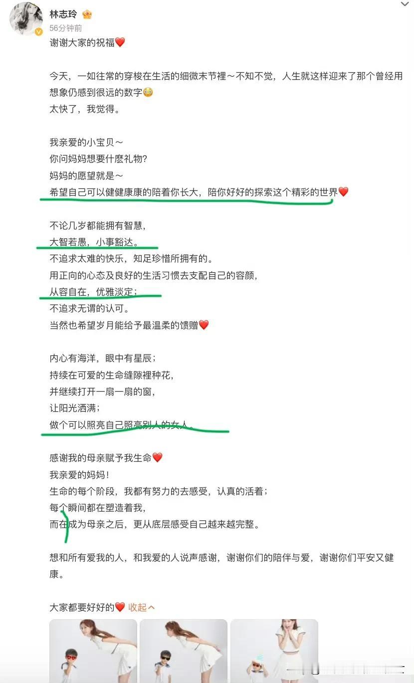 林志玲晒和儿子合照,庆祝50岁生日,超短裙造型仍似少女! 11月29日,就在刚刚,许久未露面的林志玲发长文并配和儿子的合照,庆祝她自己的50岁生日! 照片中的她,穿了一身白色超短裙款的网球套装,皮肤白皙,身材依旧修长纤细、凹凸有致。她对着儿子云嘟嘟嘴,捧着脸颊笑容灿烂的样子,完全不像是已经50岁的人。光看侧面的话,完全像个青春气息满满的少女,表情可爱又生动! 而她3岁的儿子站在一旁,虽然有挡住眼睛,但是圆圆的脸蛋,肉嘟嘟的样子,一看就很可爱!两人同框的样子,相当温馨! 志玲姐姐在长文中感慨,觉得时间过得太快了,生日最大的愿望就是陪着孩子一起健康长大,字里行间很温暖和治愈。 其实,也难怪志玲姐要发出这种感慨了,小编细细回想下,刚知道她的时候,她还是那个说话声音嗲嗲的,身材外貌都女神范十足的样子,一转眼都已经50岁了,时间真如白马过隙! 那就祝福她吧,生日快乐![心]