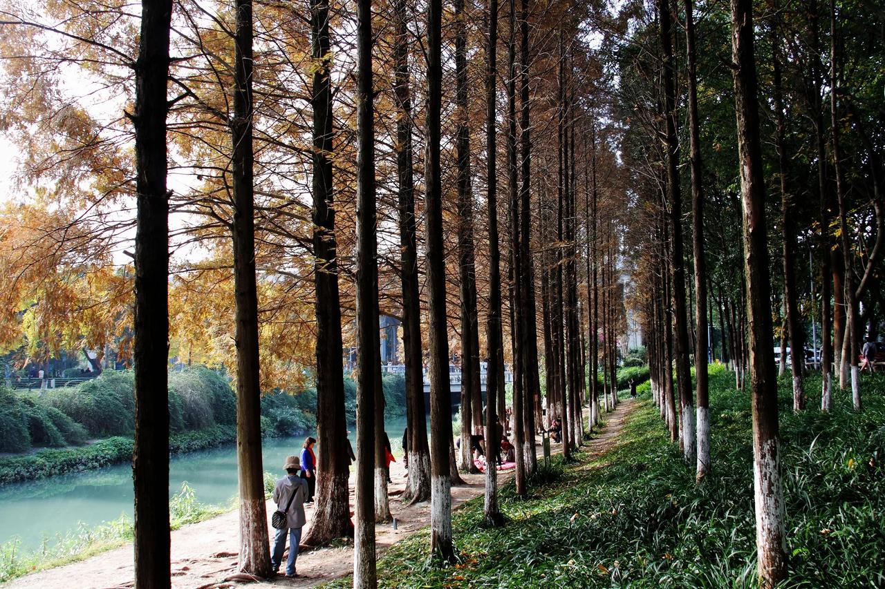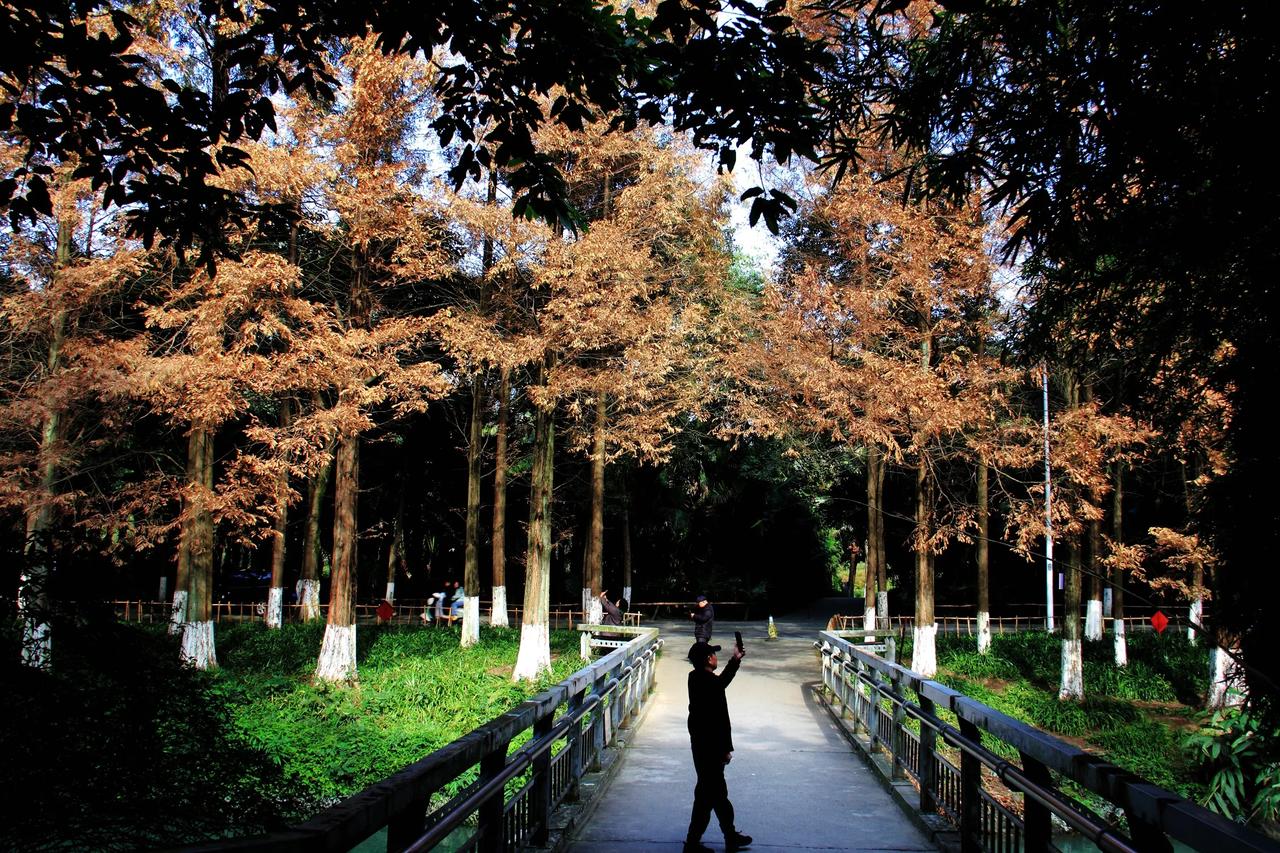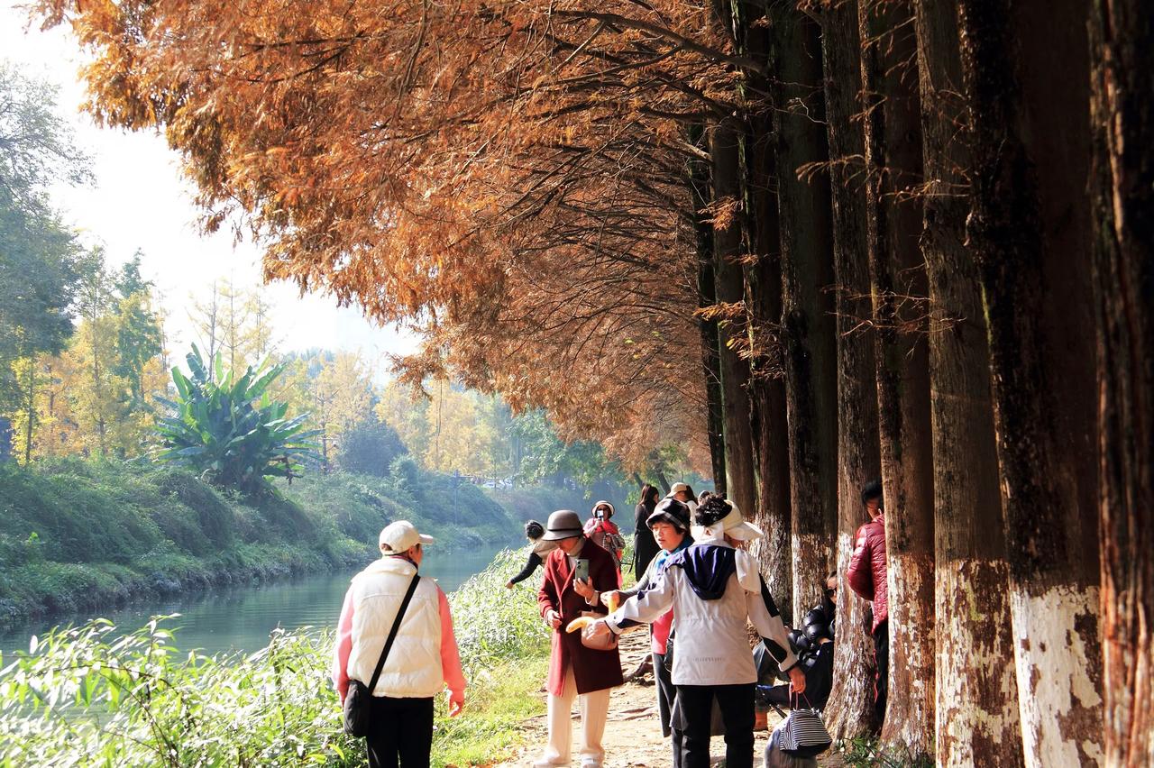 【升仙湖畔沙河边 一年一度水杉红】20241130 时光流逝已年末,季节更迭到隆冬。升仙湖畔沙河边,一年一度水杉红。 这几天,沙河边的水杉美出了圈,升仙湖成了成都最热门的网红打卡地。年年都去拍水杉,难免有点心理抗拒。无奈天气这么好,不去走一趟有点说不过去。老天爷也是作怪,前段时间阴雨连绵无阳光,想拍菊花没好天。这几天,菊花残了却又天天出太阳。说实话,水杉哪有菊花美呀?!何况,狭窄的河边人满为患,挤挤挨挨,真怕一不小心掉河里去了。 28号那天,天气不错,去了升仙湖。阳光挺好,雾气偏重。水杉有点干枯,叶片不太滋润,灰扑扑的,颜色没有往年那么红。加上雾气比较重,景色不太靓丽。不过,光线好的地方,选择好的角度,照片还算可以。 人多,拍个干净镜头不容易。往年只是大妈们在尽情欢乐,今年又多了好些“围炉煮茶”的雅士。摆开茶桌座椅,茶炉茶具,以及配套设备,或坐或躺地在河边树下喝茶晒太阳。 文人雅士,烹茶品茗,熏陶的是心境,讲究的是环境。或雅居静室,或翠竹庭院,或山石松风,讲究的还要熏香更衣。世人喝茶,就没有这么多讲究了,尤其是成都人爱坐的茶馆,那就是一个随意、热闹、大声武气摆龙门阵的地方,一个市井烟火气极浓的地方。 近年兴起的围炉煮茶,不失高雅,却又热闹,并兼具新奇时尚。似乎迎合了人们喜欢热闹从众的心理,深受欢迎,尤其是年轻人的喜爱。但那也是需要氛围的。比如三五好友闺蜜,外出野营晒太阳,优雅环境,搭个帐篷,来个围炉煮茶,逼格立刻抬升了。 劳神费力地搬那么些设备,躺坐在河边杉树下川流不息的人流里“围炉煮茶”,图个啥?这等涵养功夫,实在令人佩服。