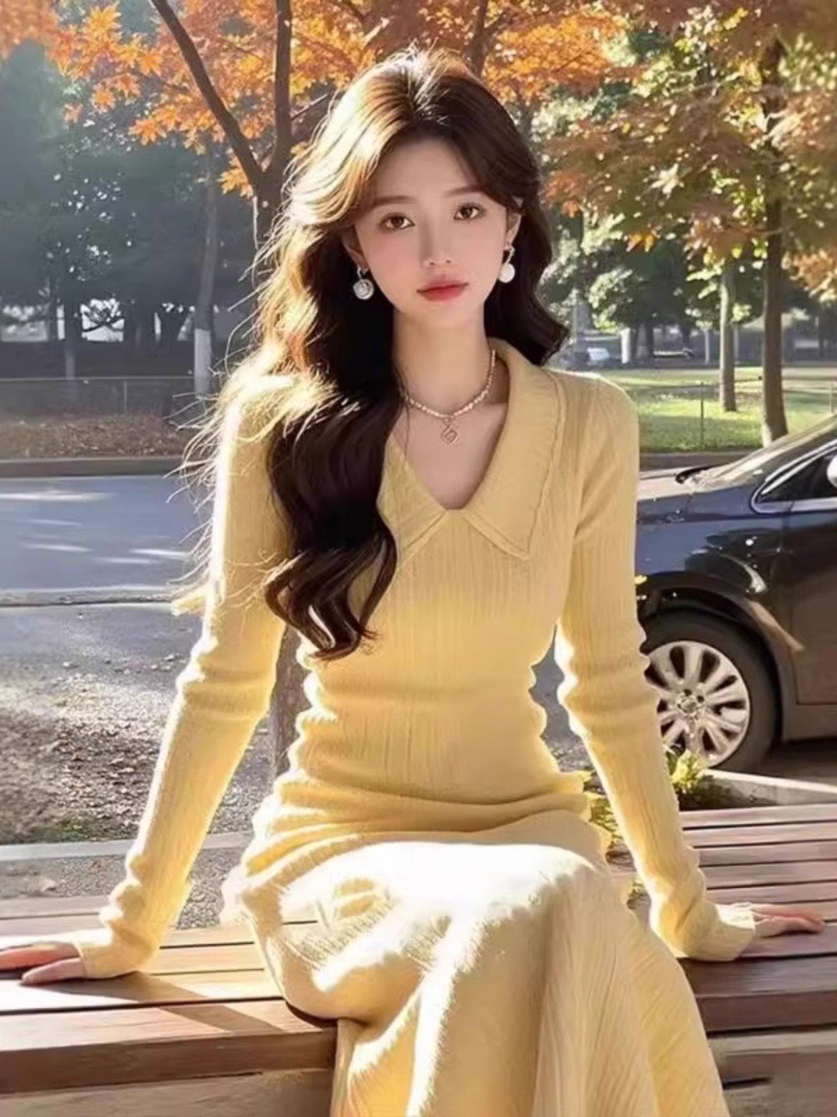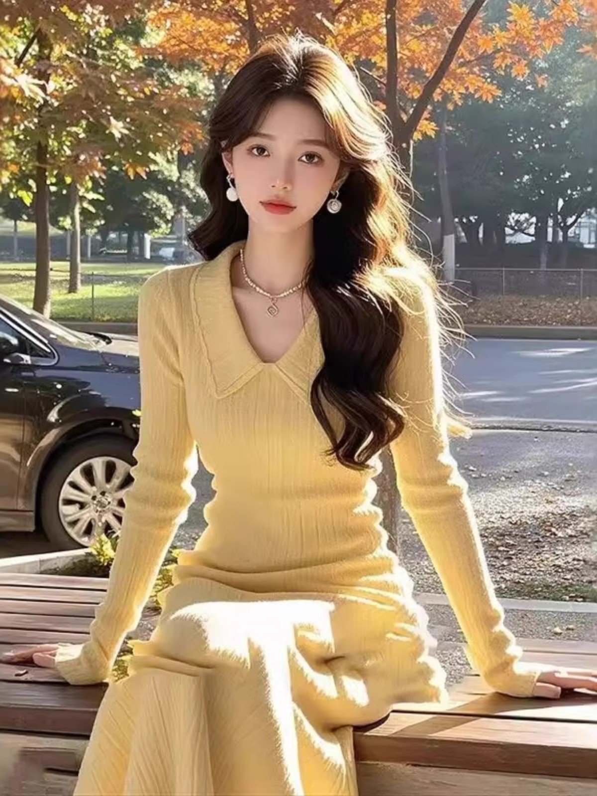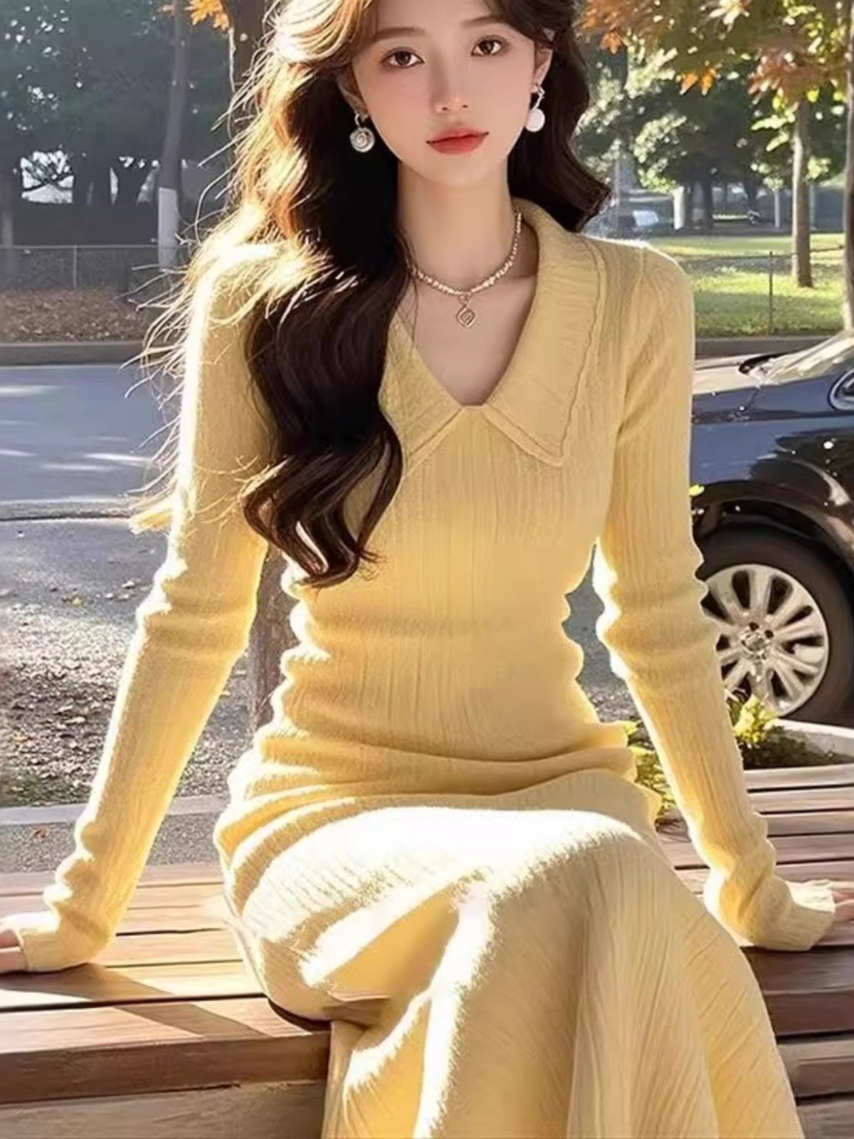 法式黄色针织毛衣内搭连衣裙女冬季名媛千金