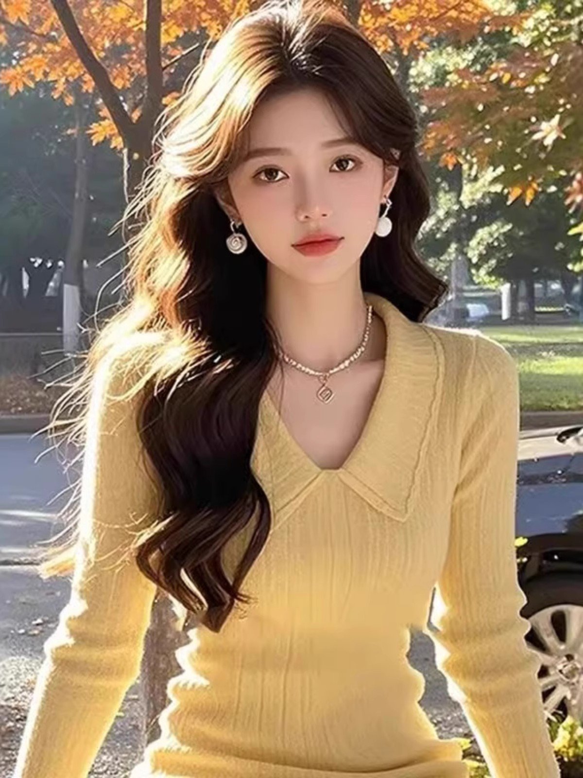 纯欲性感辣妹蕾丝v领修身长袖t恤女冬季