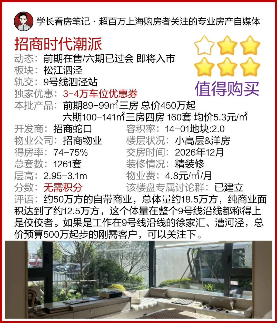 推出建面约100-141㎡房源,均价约53168元/㎡! ⛩项目名称:「招商时代潮派」六期 👑项目简介:松江泗泾 品质新房 🗣最新动态:预计12月取证入市 📍区域板块:松江泗泾 🏠产品介绍:建推出建面约100-141㎡房源,均价约53168元/㎡! 🛍️商业配套:三湘商业广场、保利悦活荟 🚇交通配套:9号线泗泾站 🏫周边学校:泗泾中心幼儿园、泗泾小学、松江实验学校等 大家对这个盘怎么看,会好卖吗?我们评论区聊聊吧~