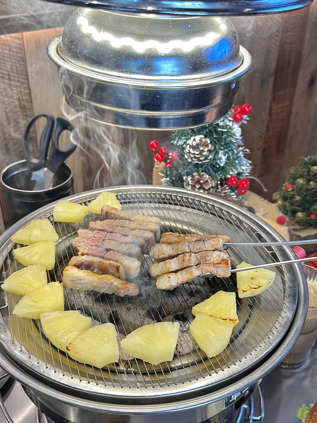 里面夹入烤好的牛肉片,菠萝,最后沾上牛乳酱,一口一个吃到爽