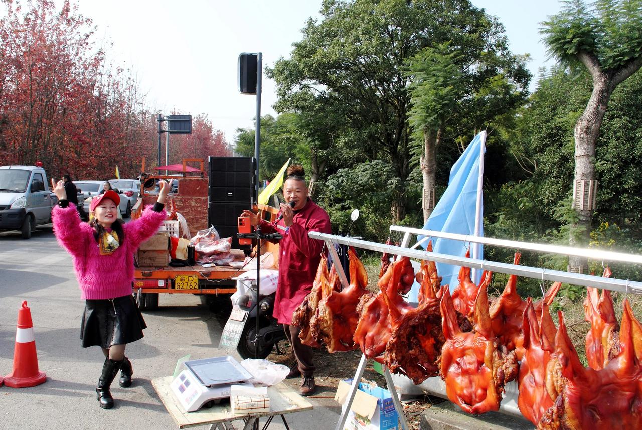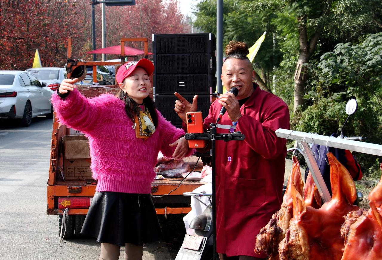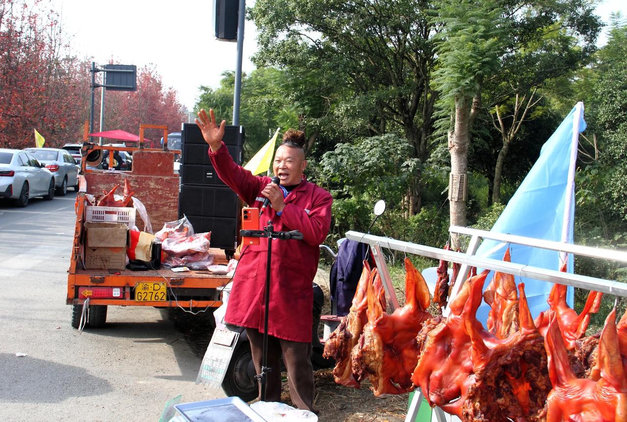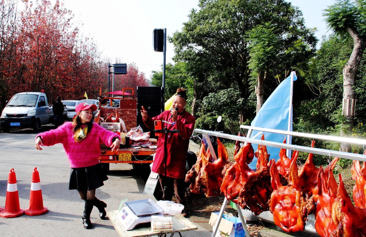 【欢乐的“腊猪头”】20241203 在板桥红枫林景区外的路边,有好些摊贩售卖蔬菜腊肉香肠。其中一对小夫妻售卖的是腊猪头。挂在架子上的腊猪头,红亮油润,色泽亮丽,十分喜人,品质不错。尝尝煮熟的样品,咸淡合适,挺好吃。围观的人多,生意挺好。摊主小伙子长相喜感,小眼睛,大嘴巴,发型丸子头。总是一脸笑眯眯地应对顾客讨价还价,游刃有余。 他们俩还带有音响设备,售货之余,男唱女舞,表演节目,活跃气氛,吸引游客。唱得一般,满腔热情。跳得简单,欢乐四溢。他们的情绪,感染了围观的游客,给大家带来了愉悦,掌声热烈。良好的气氛带动了销售,所以他们的生意最好,一会儿就卖了好几个腊猪头。一斤24元,一个猪头也就100多元。据说,一天要卖几十个,也有好几百的盈利了吧。现在的年轻人,心眼活,赚钱有门道。只要勤奋,自然生活无忧。也要感谢街道社区,举办了这个红枫节,给他们搭建了大显身手的舞台。 短文取名《欢乐的“腊猪头”》,没有一丝贬义,旨在善意诙谐。要不,你仔细3看看架上的挂的腊猪头,是不是有点“笑眯眯”的模样?!
