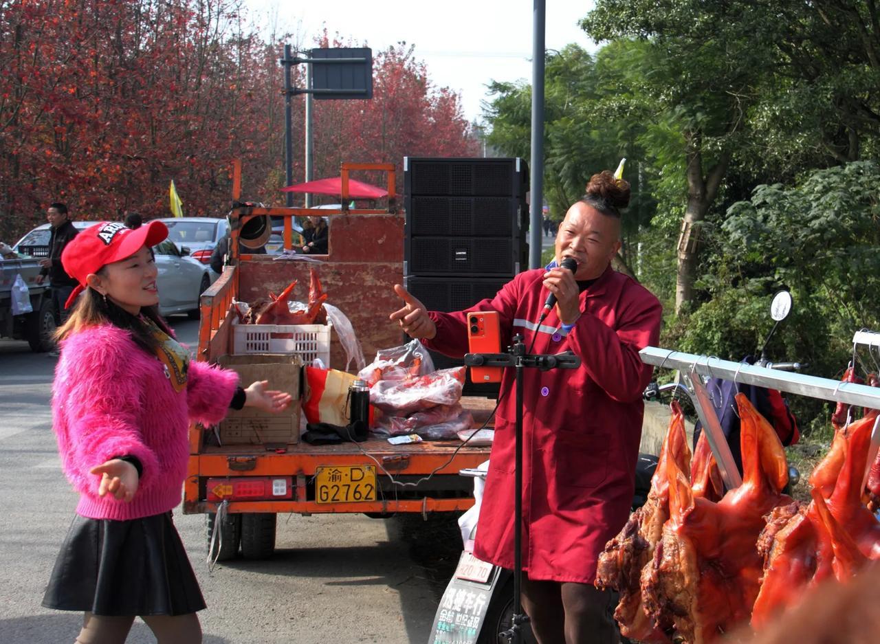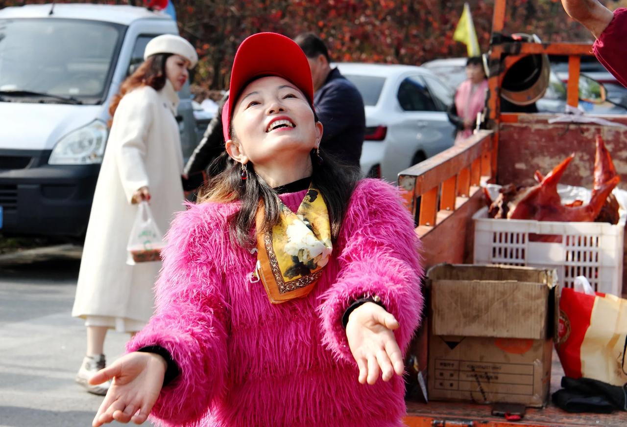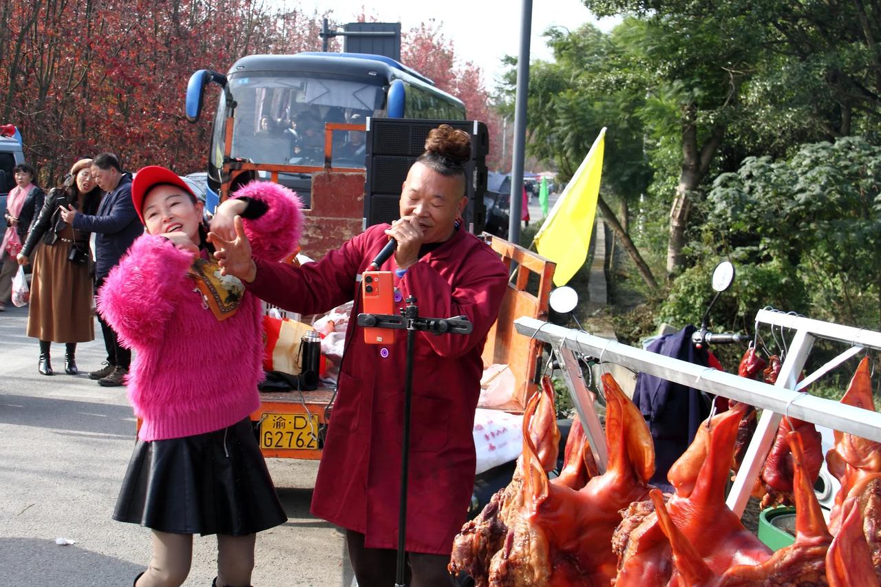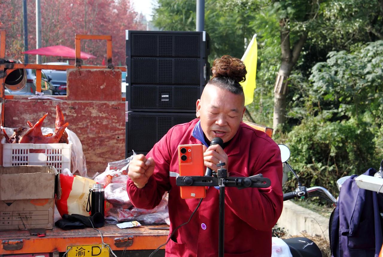 【欢乐的“腊猪头”】20241203 在板桥红枫林景区外的路边,有好些摊贩售卖蔬菜腊肉香肠。其中一对小夫妻售卖的是腊猪头。挂在架子上的腊猪头,红亮油润,色泽亮丽,十分喜人,品质不错。尝尝煮熟的样品,咸淡合适,挺好吃。围观的人多,生意挺好。摊主小伙子长相喜感,小眼睛,大嘴巴,发型丸子头。总是一脸笑眯眯地应对顾客讨价还价,游刃有余。 他们俩还带有音响设备,售货之余,男唱女舞,表演节目,活跃气氛,吸引游客。唱得一般,满腔热情。跳得简单,欢乐四溢。他们的情绪,感染了围观的游客,给大家带来了愉悦,掌声热烈。良好的气氛带动了销售,所以他们的生意最好,一会儿就卖了好几个腊猪头。一斤24元,一个猪头也就100多元。据说,一天要卖几十个,也有好几百的盈利了吧。现在的年轻人,心眼活,赚钱有门道。只要勤奋,自然生活无忧。也要感谢街道社区,举办了这个红枫节,给他们搭建了大显身手的舞台。 短文取名《欢乐的“腊猪头”》,没有一丝贬义,旨在善意诙谐。要不,你仔细3看看架上的挂的腊猪头,是不是有点“笑眯眯”的模样?!
