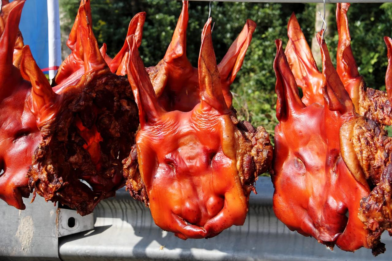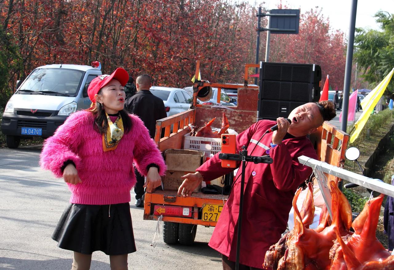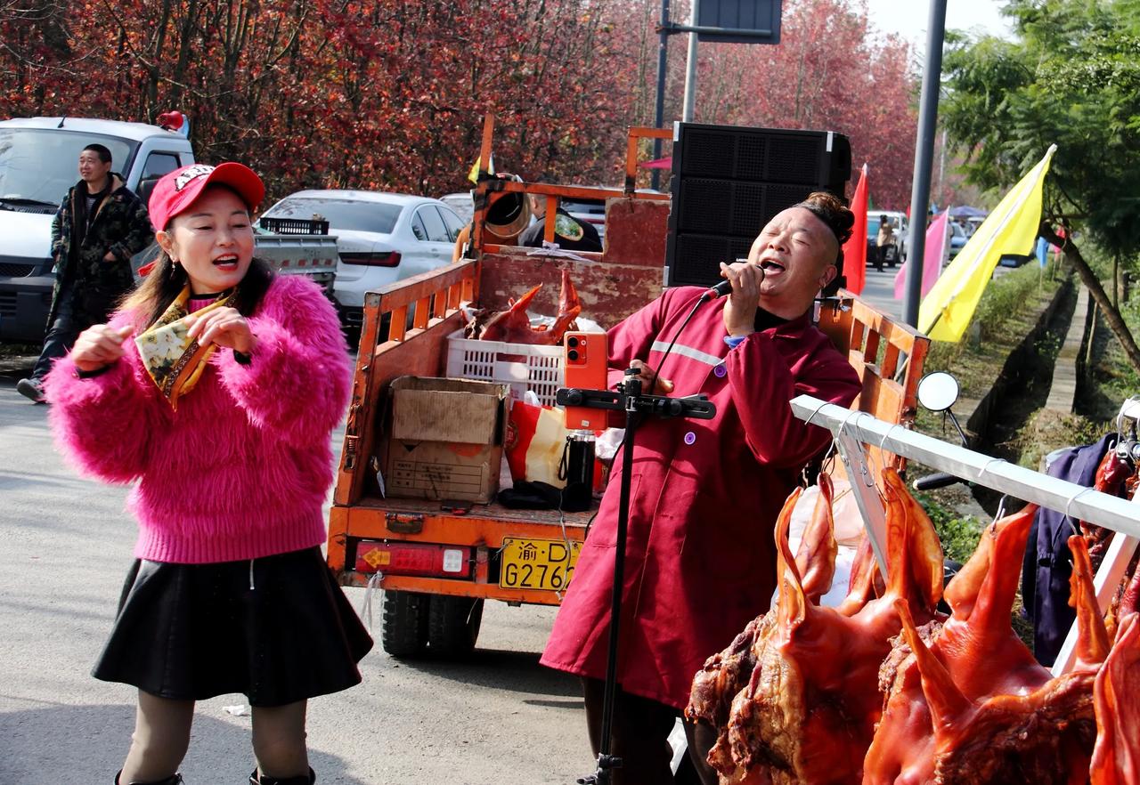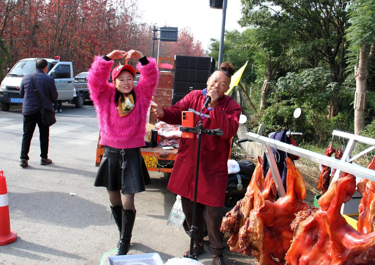 【欢乐的“腊猪头”】20241203 在板桥红枫林景区外的路边,有好些摊贩售卖蔬菜腊肉香肠。其中一对小夫妻售卖的是腊猪头。挂在架子上的腊猪头,红亮油润,色泽亮丽,十分喜人,品质不错。尝尝煮熟的样品,咸淡合适,挺好吃。围观的人多,生意挺好。摊主小伙子长相喜感,小眼睛,大嘴巴,发型丸子头。总是一脸笑眯眯地应对顾客讨价还价,游刃有余。 他们俩还带有音响设备,售货之余,男唱女舞,表演节目,活跃气氛,吸引游客。唱得一般,满腔热情。跳得简单,欢乐四溢。他们的情绪,感染了围观的游客,给大家带来了愉悦,掌声热烈。良好的气氛带动了销售,所以他们的生意最好,一会儿就卖了好几个腊猪头。一斤24元,一个猪头也就100多元。据说,一天要卖几十个,也有好几百的盈利了吧。现在的年轻人,心眼活,赚钱有门道。只要勤奋,自然生活无忧。也要感谢街道社区,举办了这个红枫节,给他们搭建了大显身手的舞台。 短文取名《欢乐的“腊猪头”》,没有一丝贬义,旨在善意诙谐。要不,你仔细3看看架上的挂的腊猪头,是不是有点“笑眯眯”的模样?!