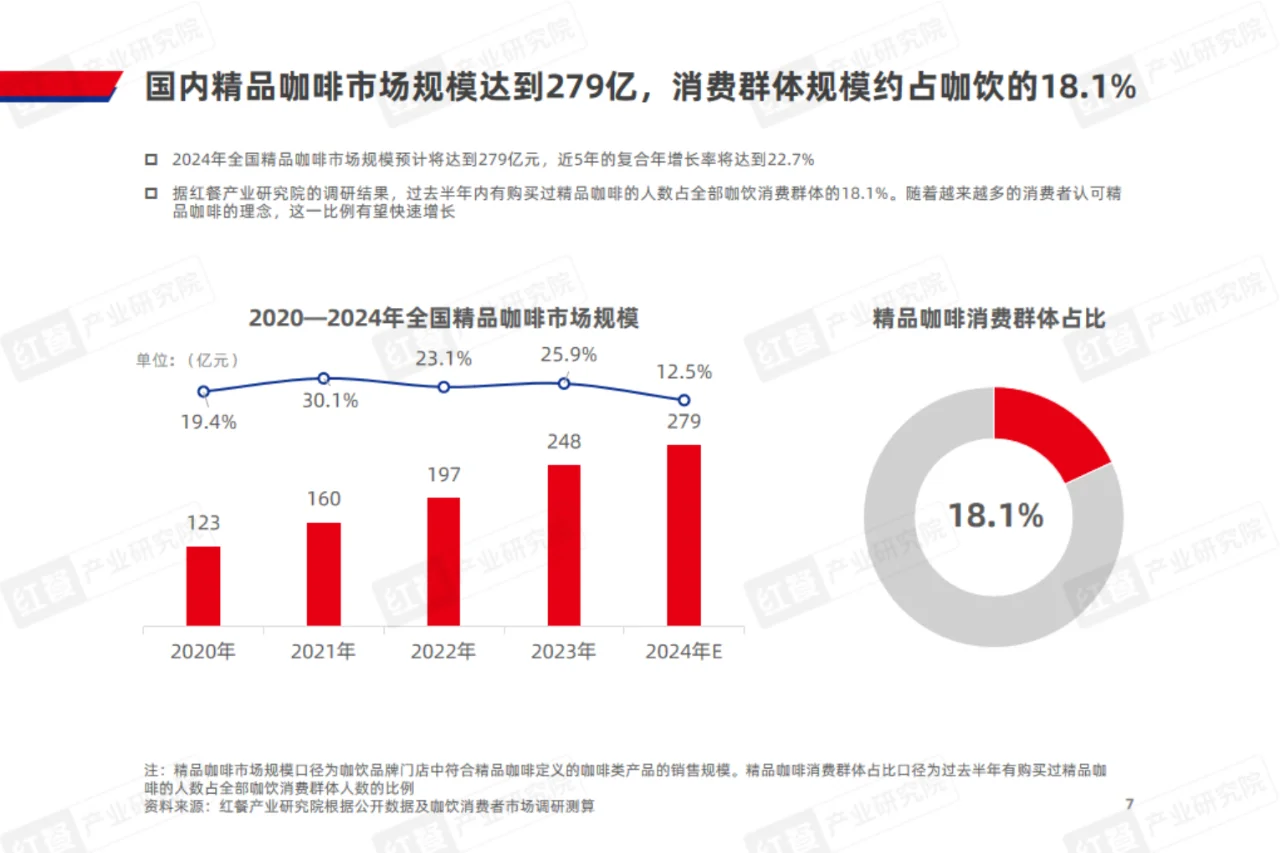 精品咖啡市场正以迅猛的势头增长。据2024年的数据显示,全国咖饮市场规模已达到1177亿元,同比增长15.4%。精品咖啡市场规模预计将达到279亿元,近5年的复合年增长率为22.7%。精品咖啡消费群体规模约占整个咖啡市场的18.1%,显示出消费者对精品咖啡的日益青睐。