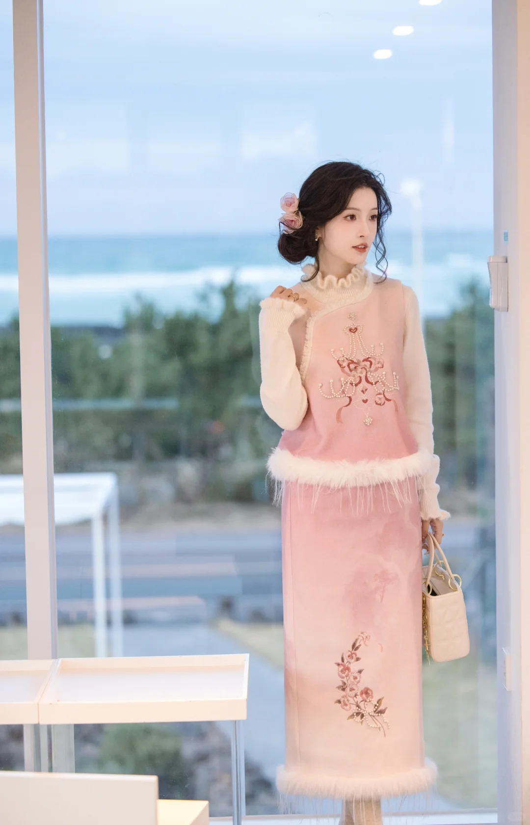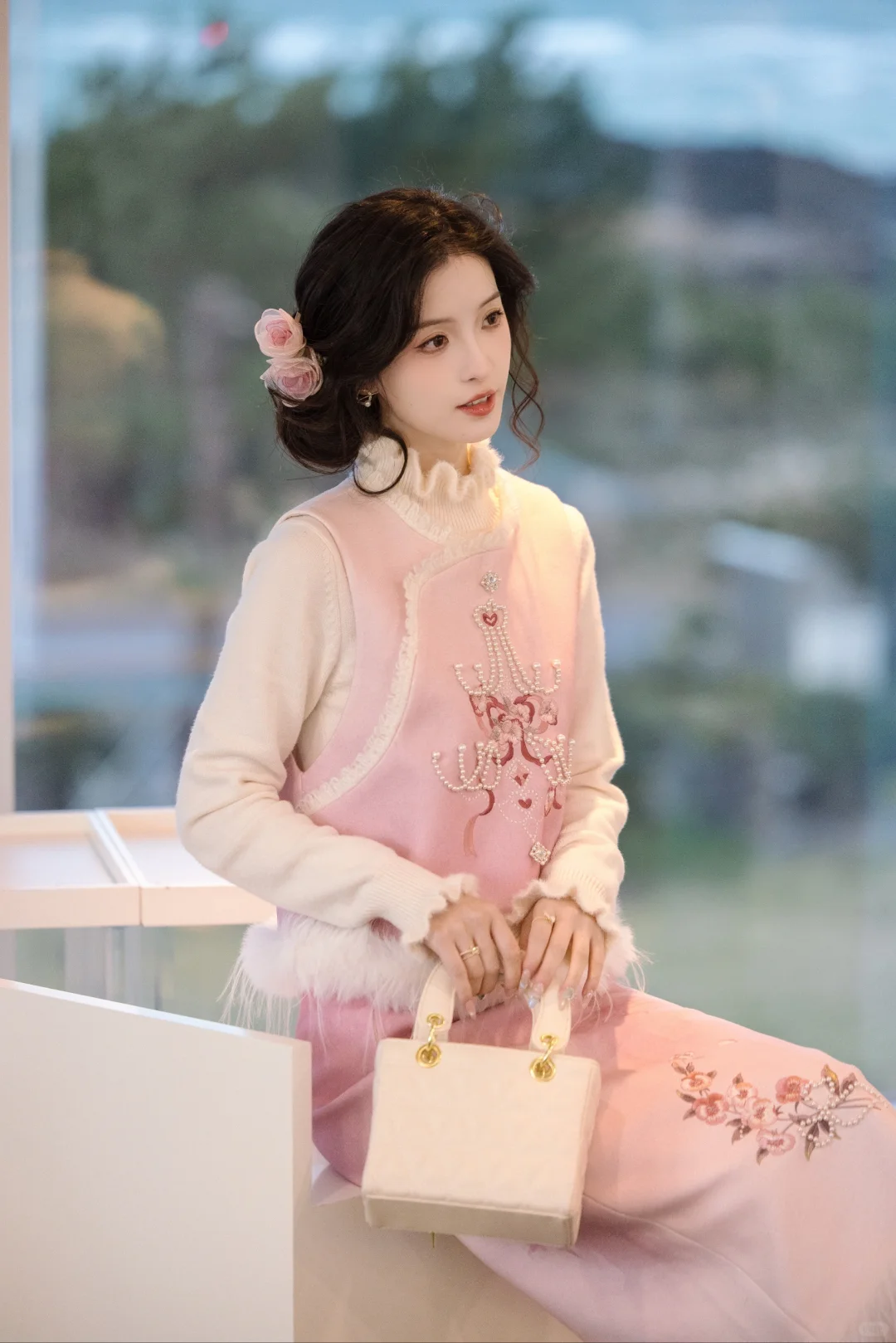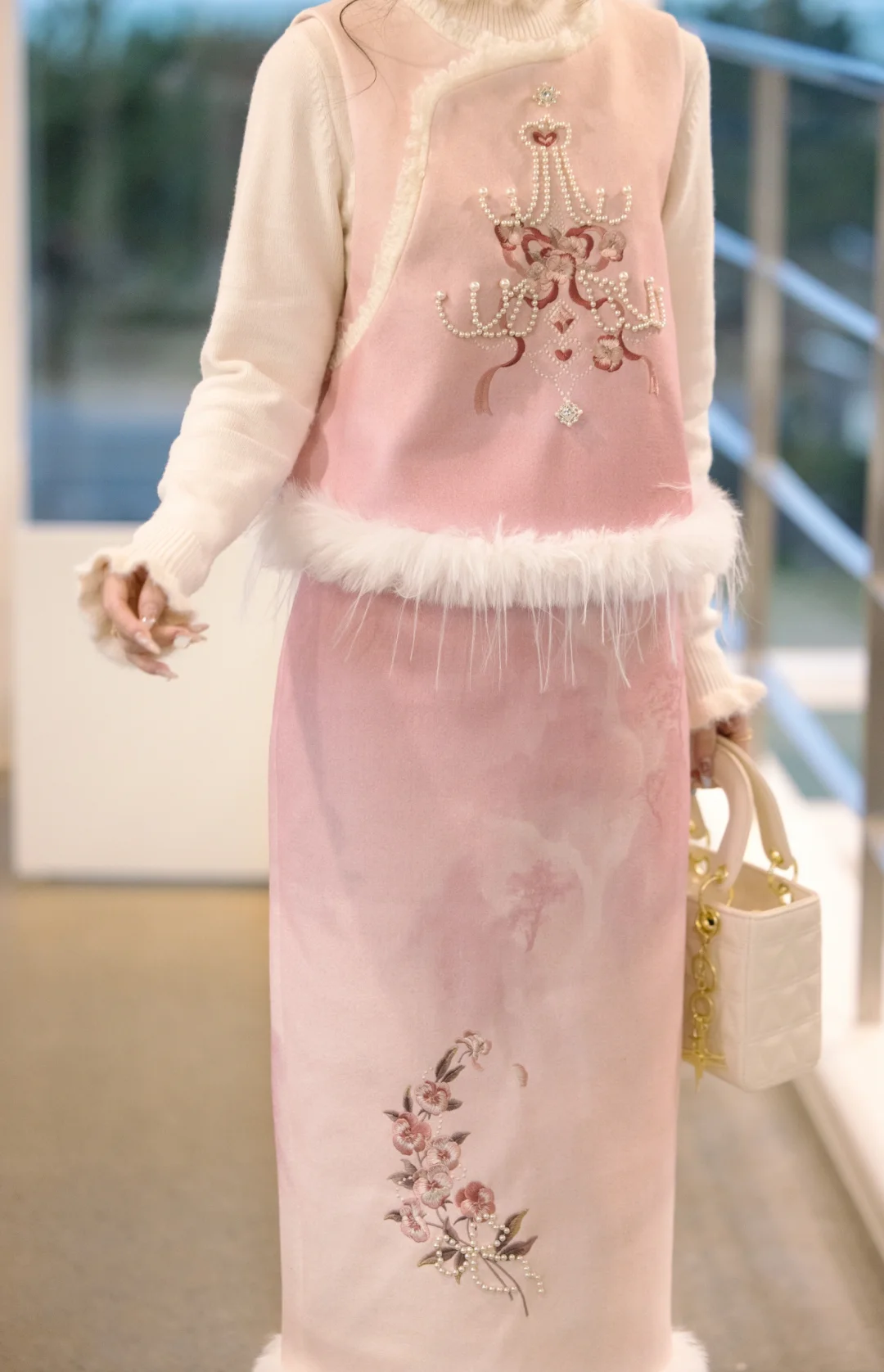 好有贵气优雅千金既视感[派对R] . 柔和色彩上的晕染像是晚霞 淡淡的山水画绘制于衣间 很有浪漫氛围~ . 特别值得一提的是这个马甲!用了特殊工艺刺绣设计 三色堇+洋风感吊灯 搭配手工钉珠工艺,圆润的珍珠与宝石,在光线的流动下闪烁细腻光泽 整件质感与细节上都超级丰富精致[喝奶茶R]
