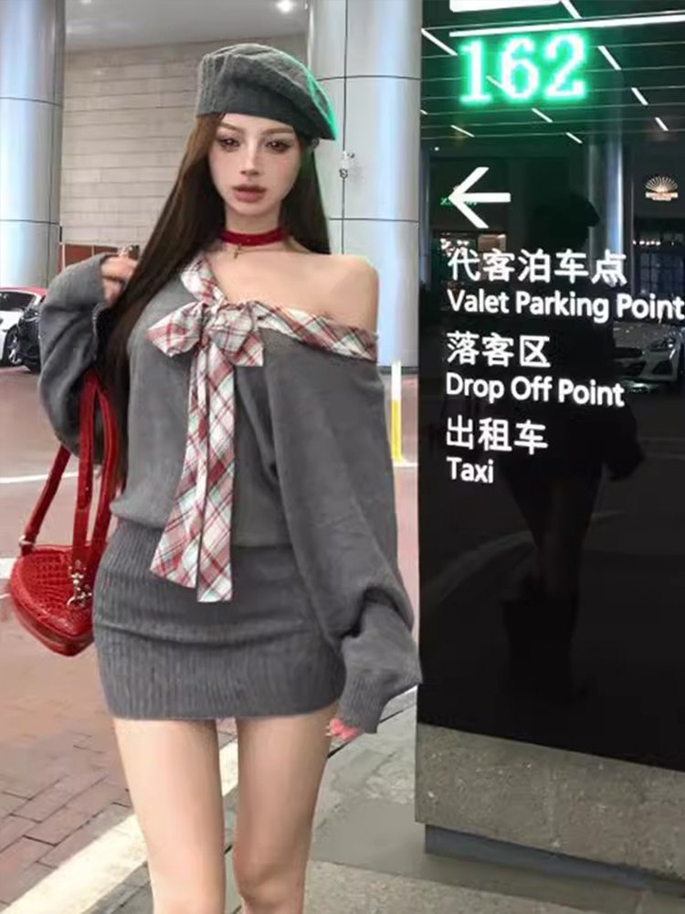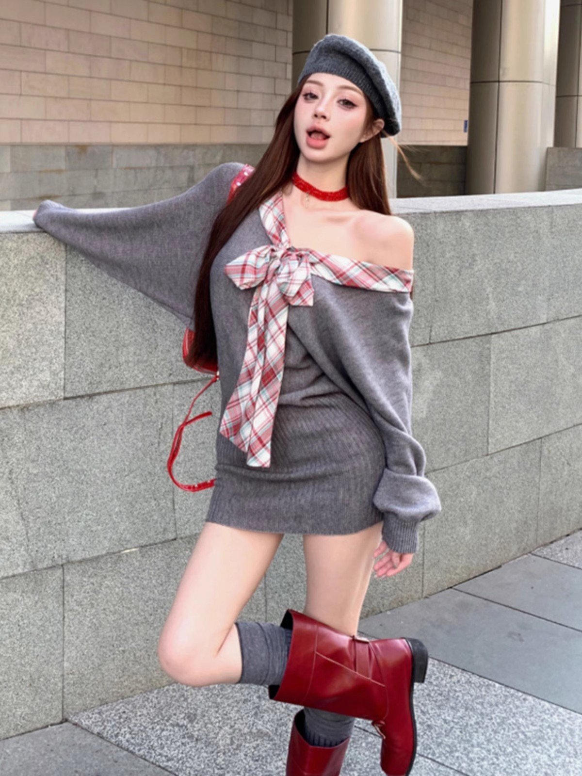 灰色斜领一字肩针织毛衣连衣裙女冬季圣诞穿