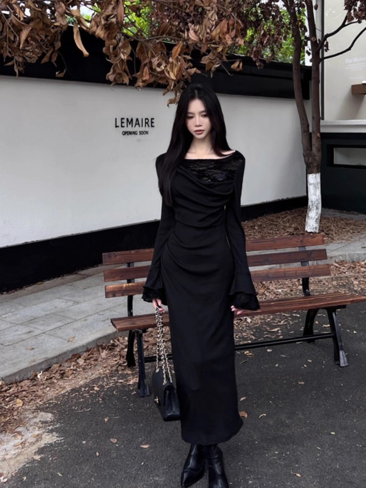 法式黑色蕾丝荡领内搭连衣裙女冬季高级性感