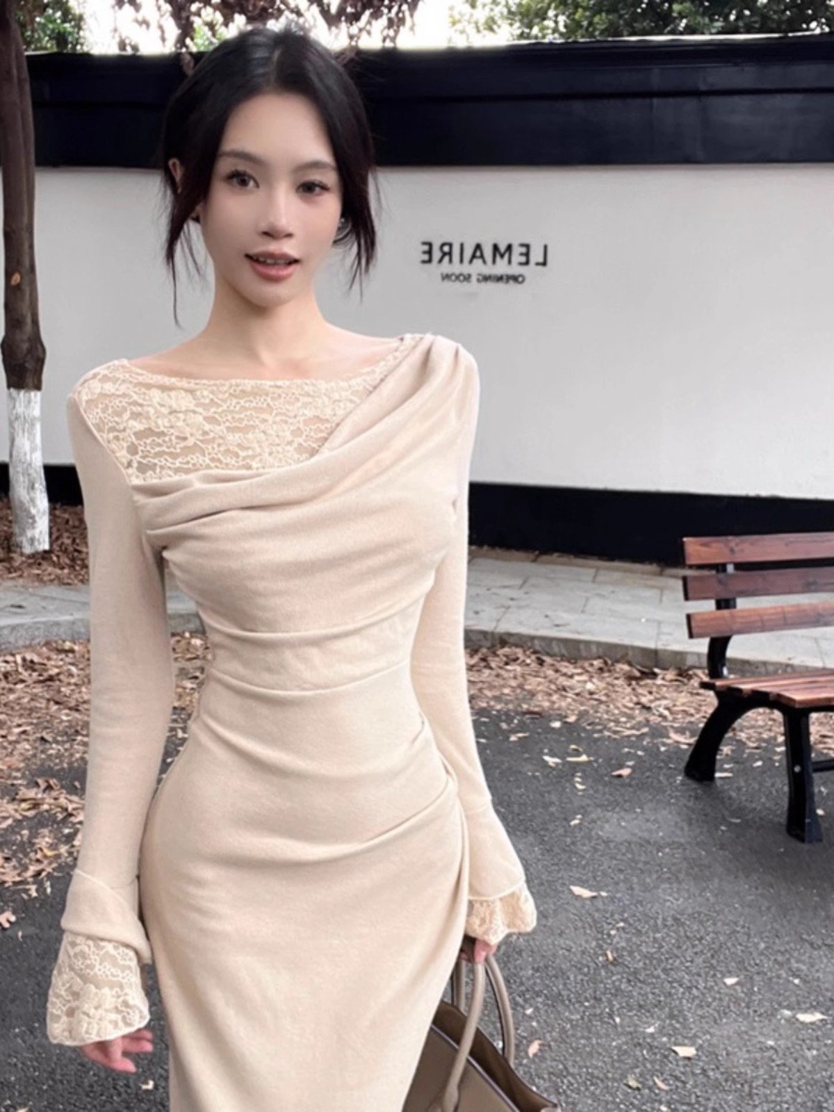 法式荡领露肩浅色针织内搭连衣裙女冬季高级