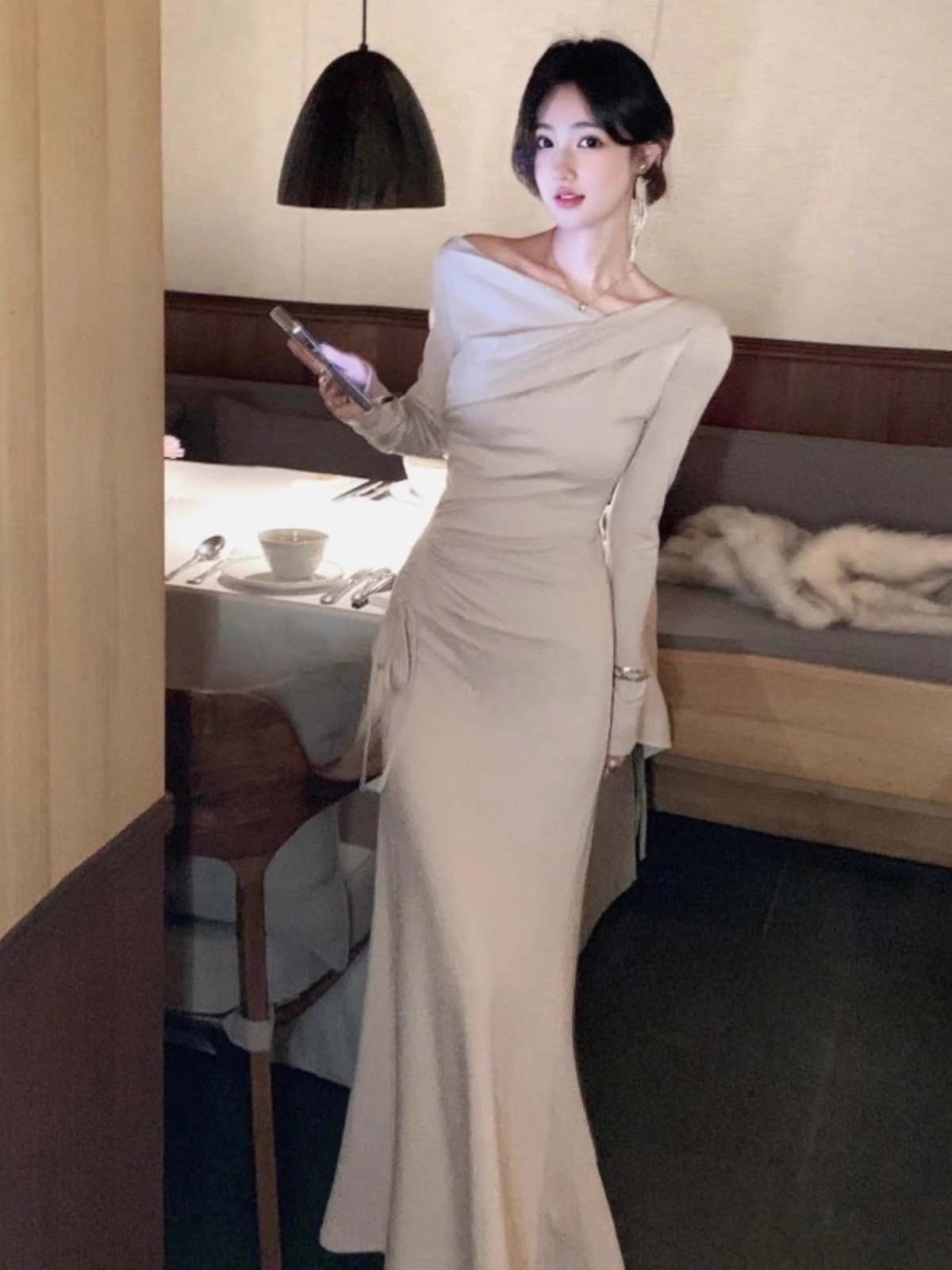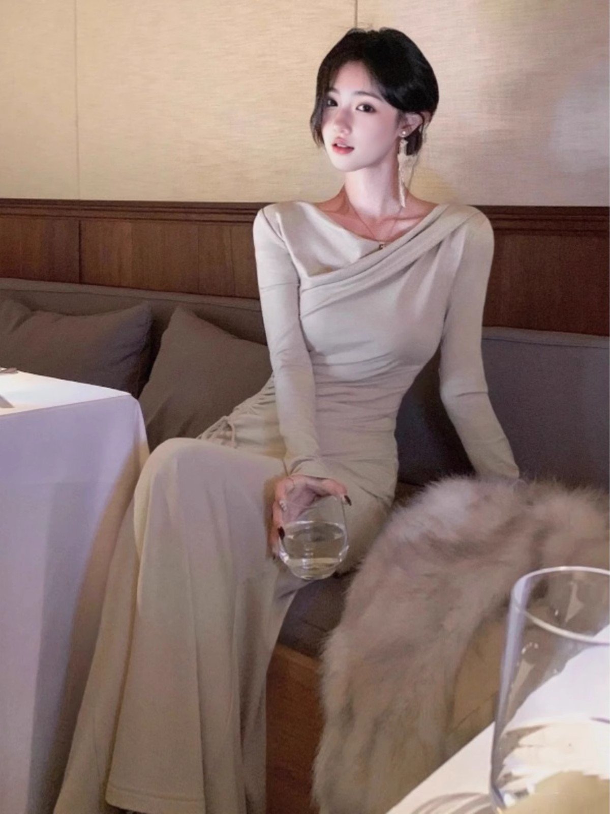 法式荡领露肩浅色针织内搭连衣裙女冬季高级