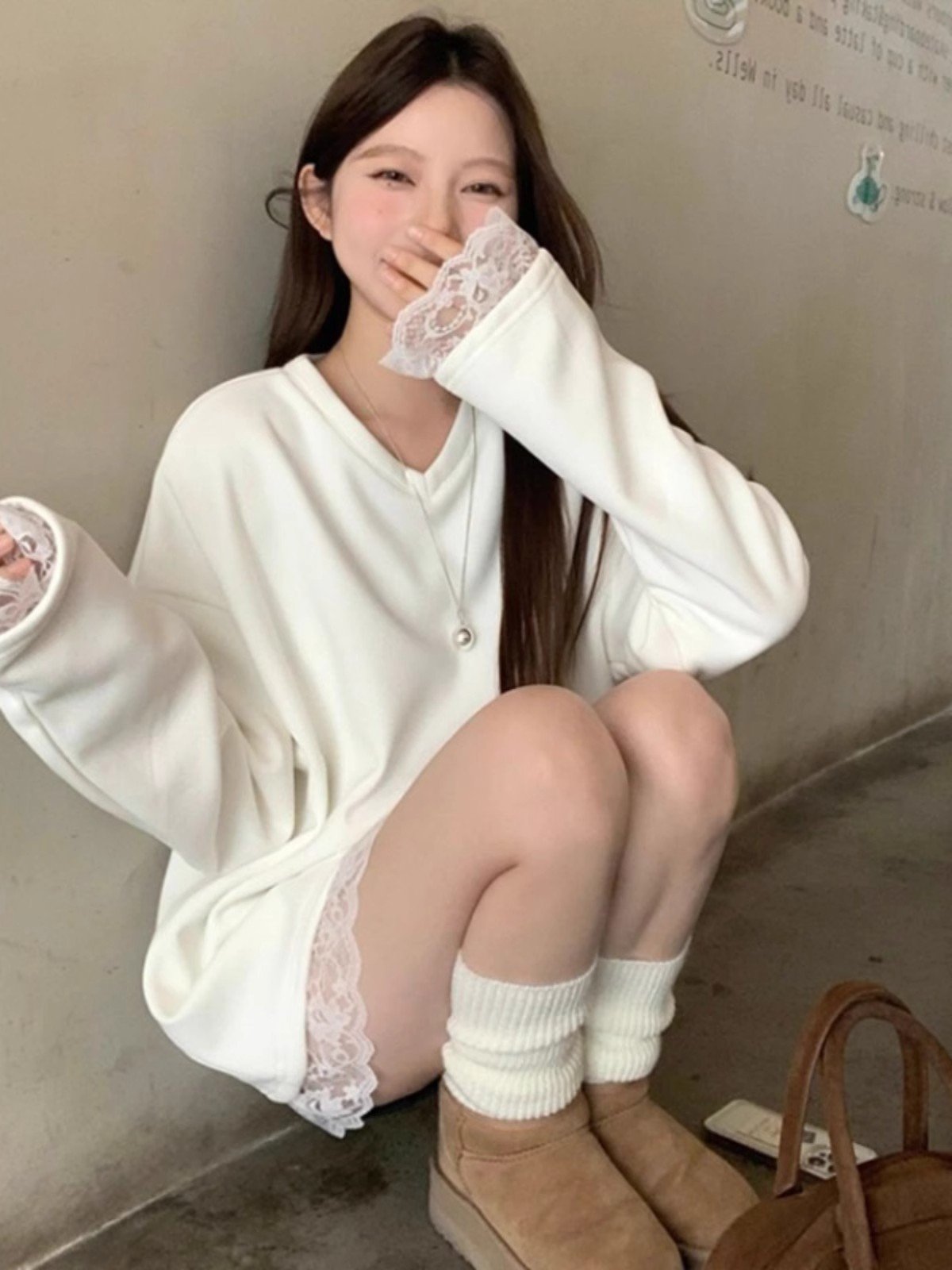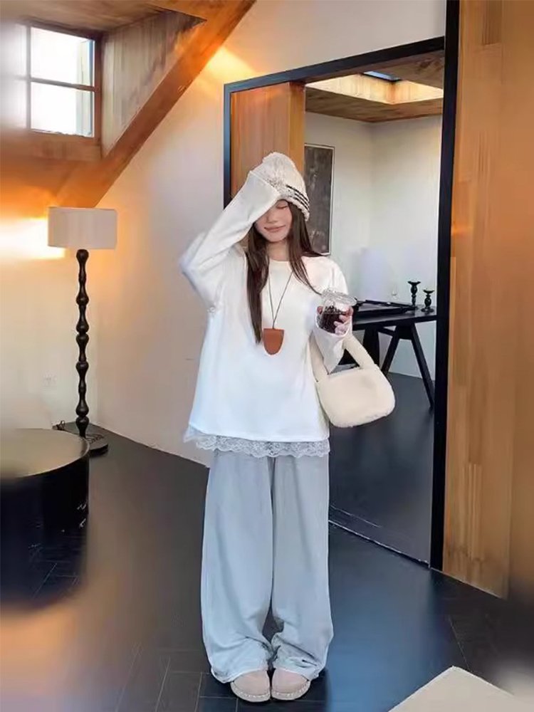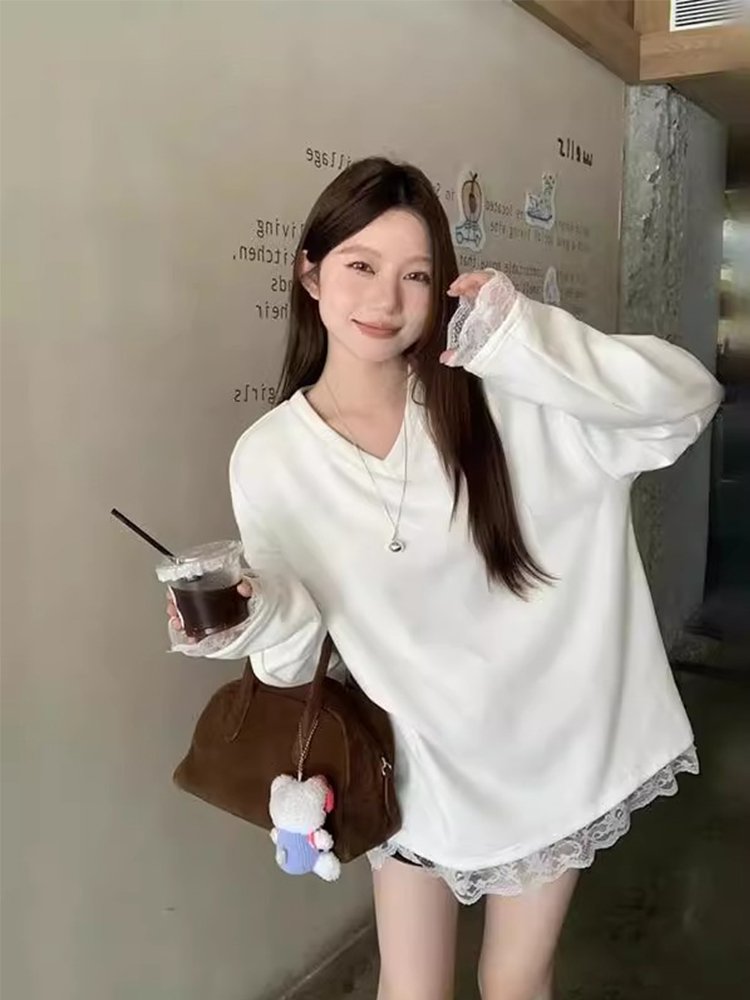 白色蕾丝花边拼接v领长袖t恤女冬季加绒
