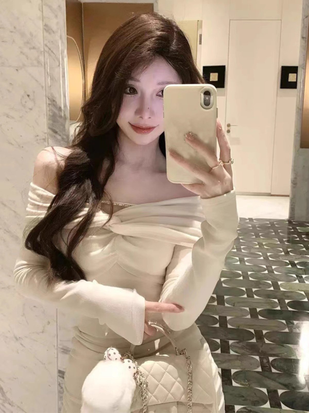 白色扭结一字肩内搭连衣裙女冬季小个子气质