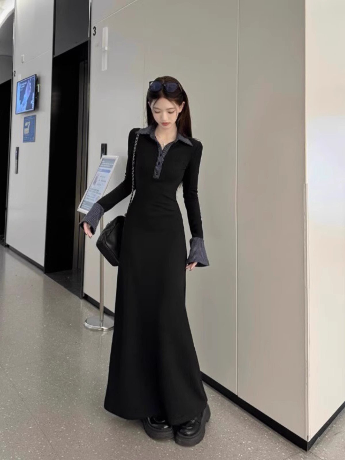 法式复古假两件露肩牛仔针织连衣裙女秋冬